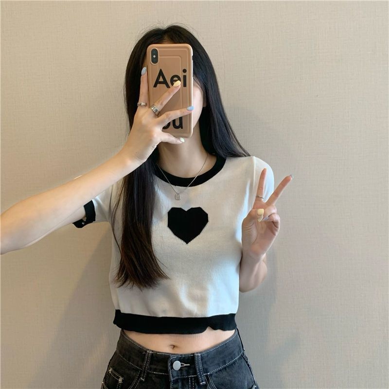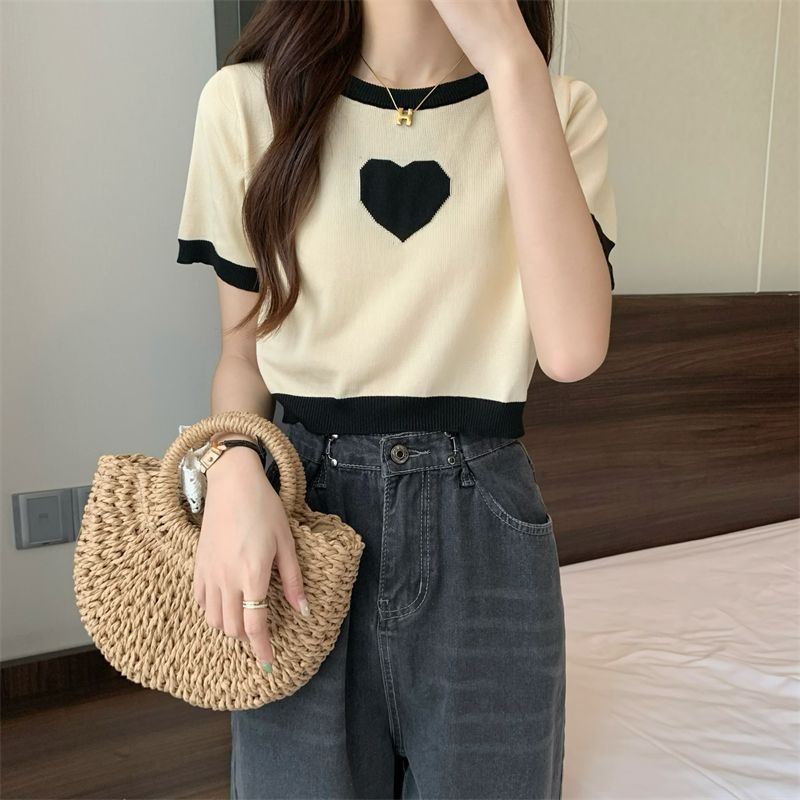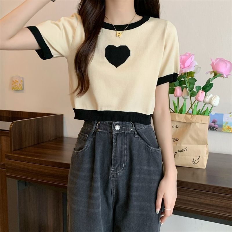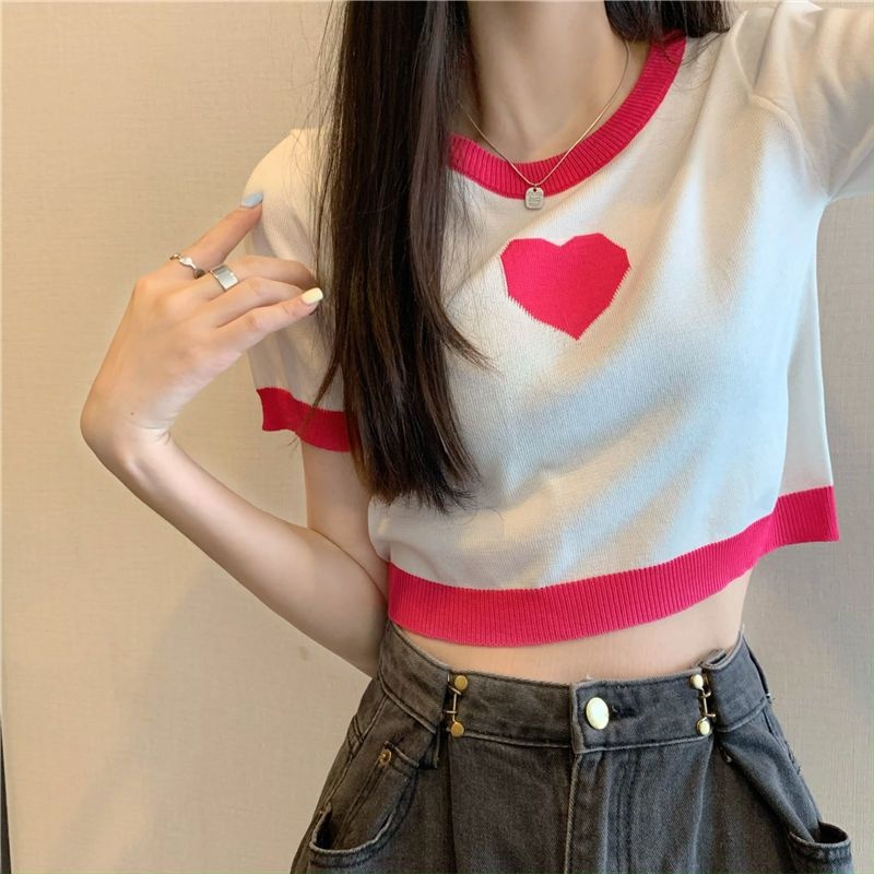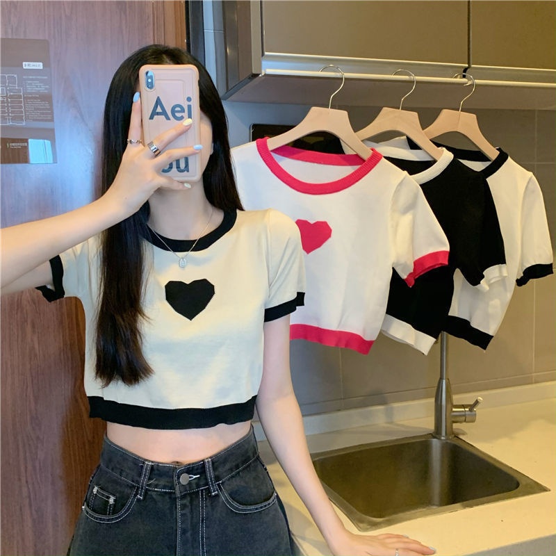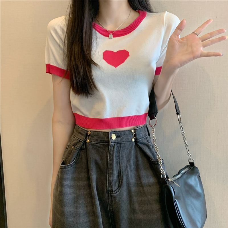 设计感撞色爱心正肩T恤女夏季2023新款甜辣短款宽松针织短袖上衣