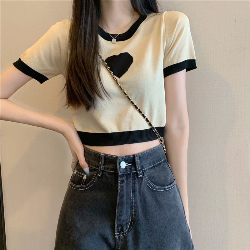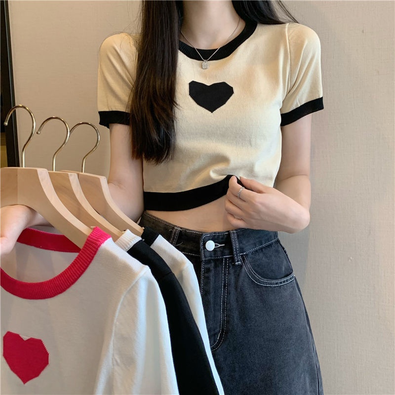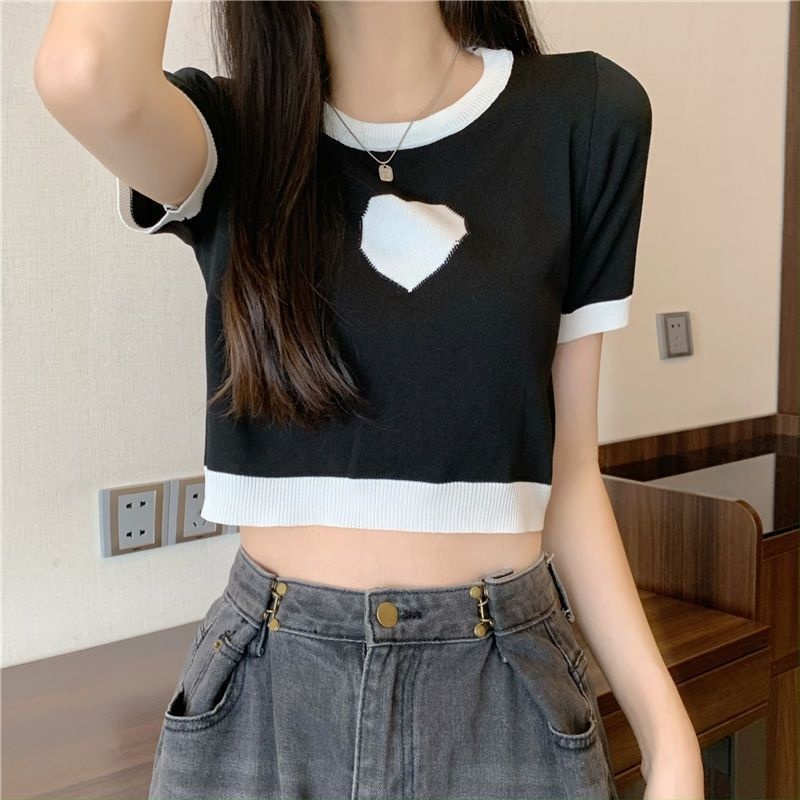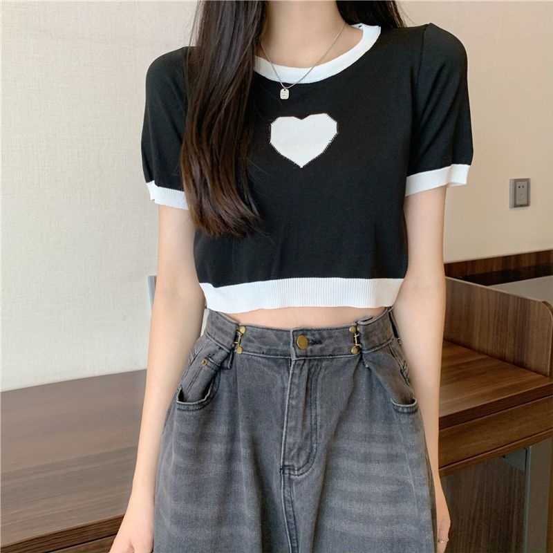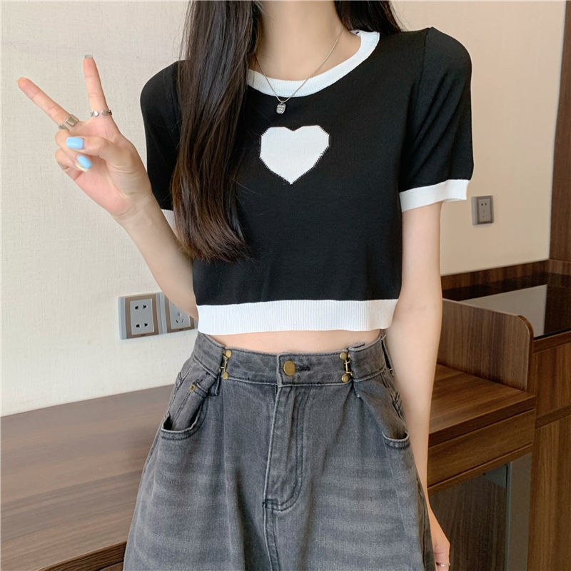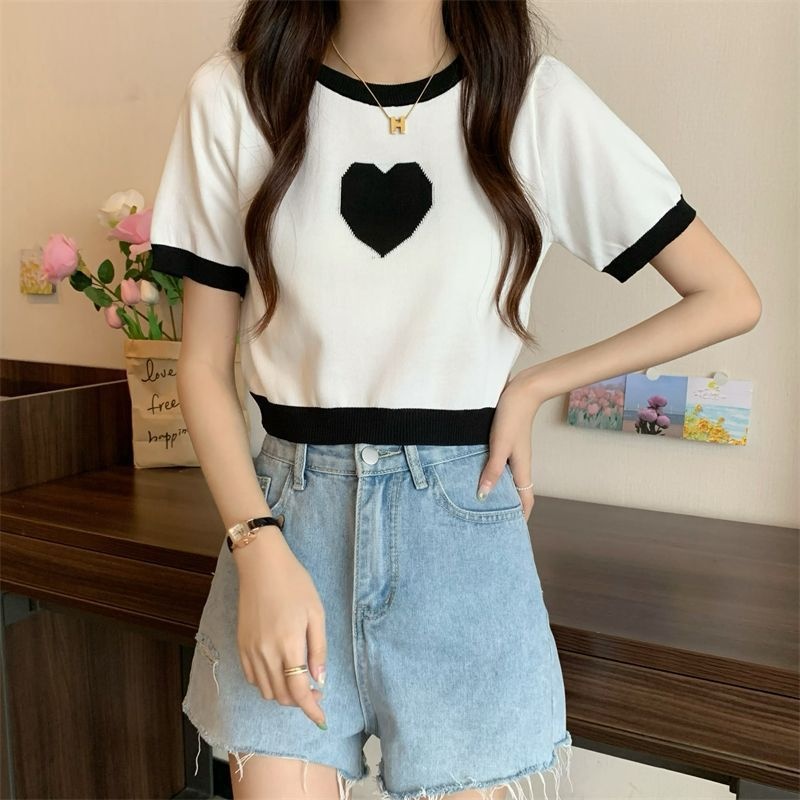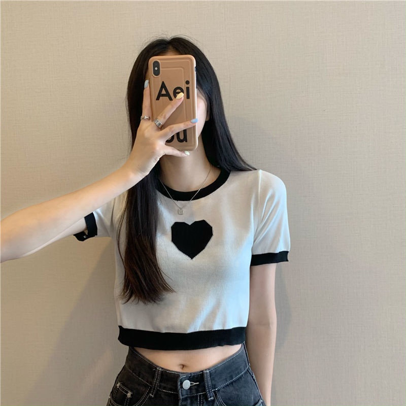 设计感撞色爱心正肩T恤女夏季2023新款甜辣短款宽松针织短袖上衣