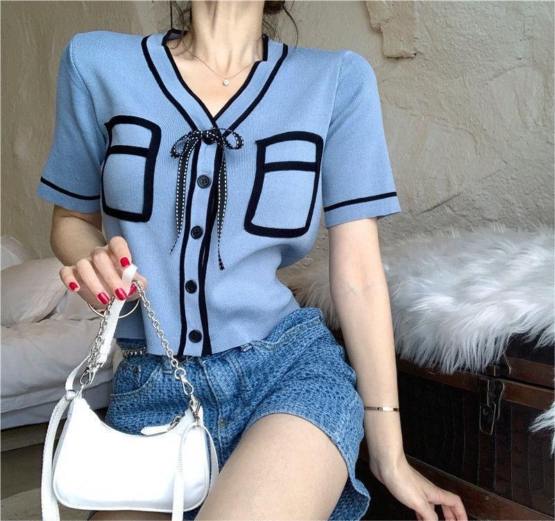 2023夏季新款小香风薄款开衫短款上衣拼色短袖设计感百搭针织衫女