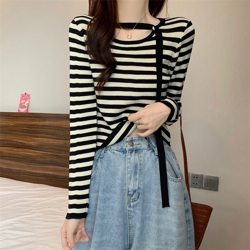 韩风简约长袖针织衫女 秋季新款设计感小众短款打底衫修身t恤上衣