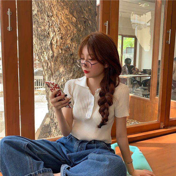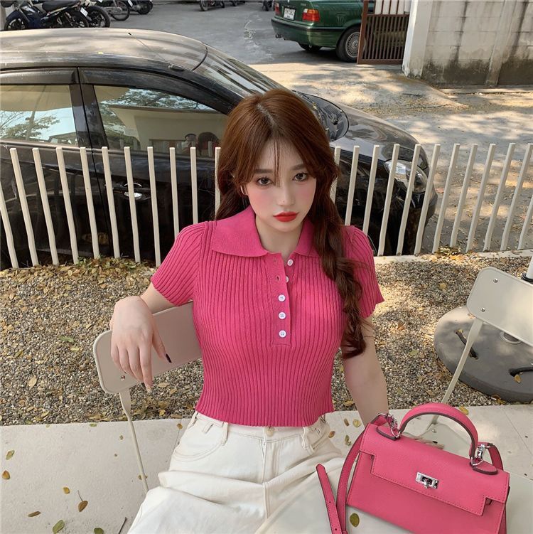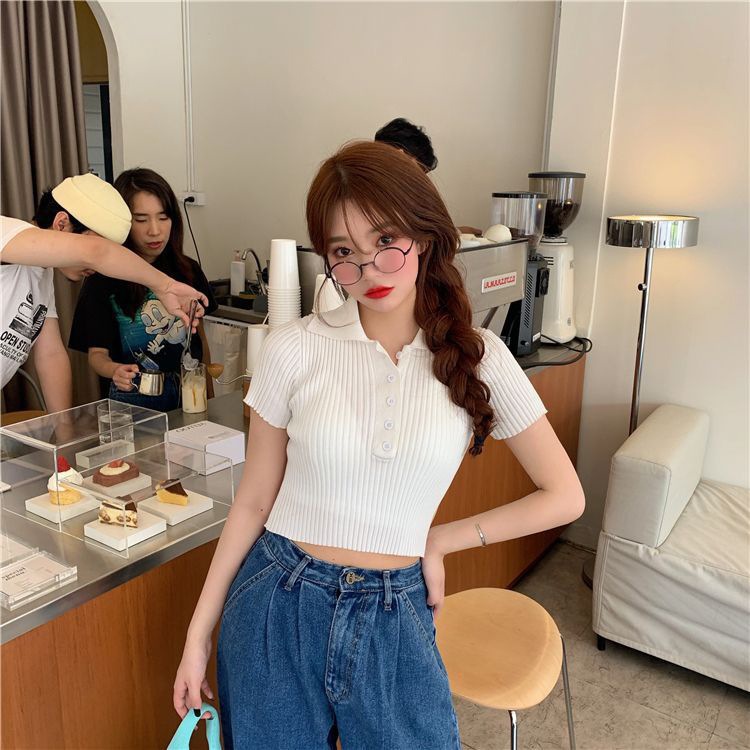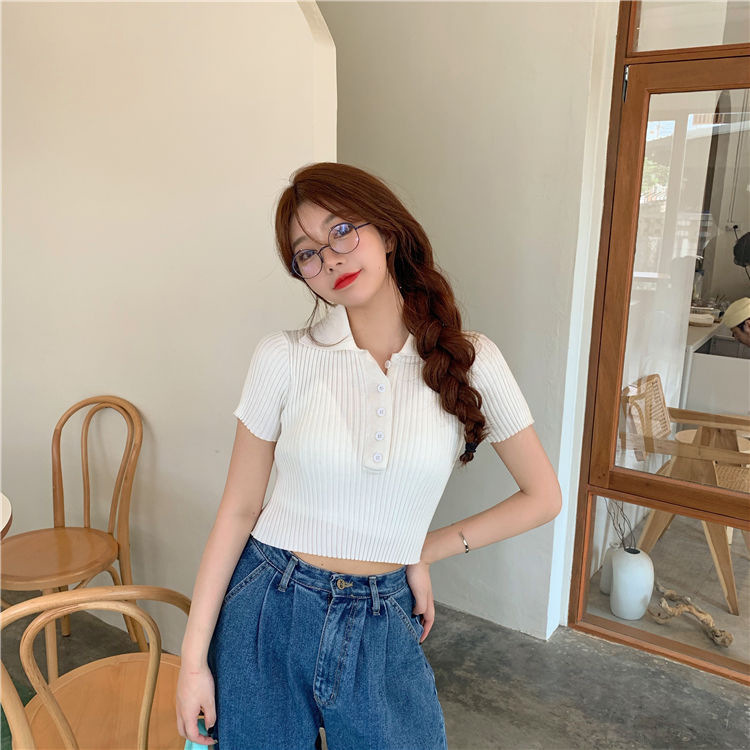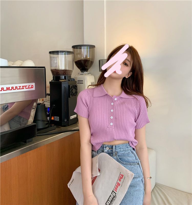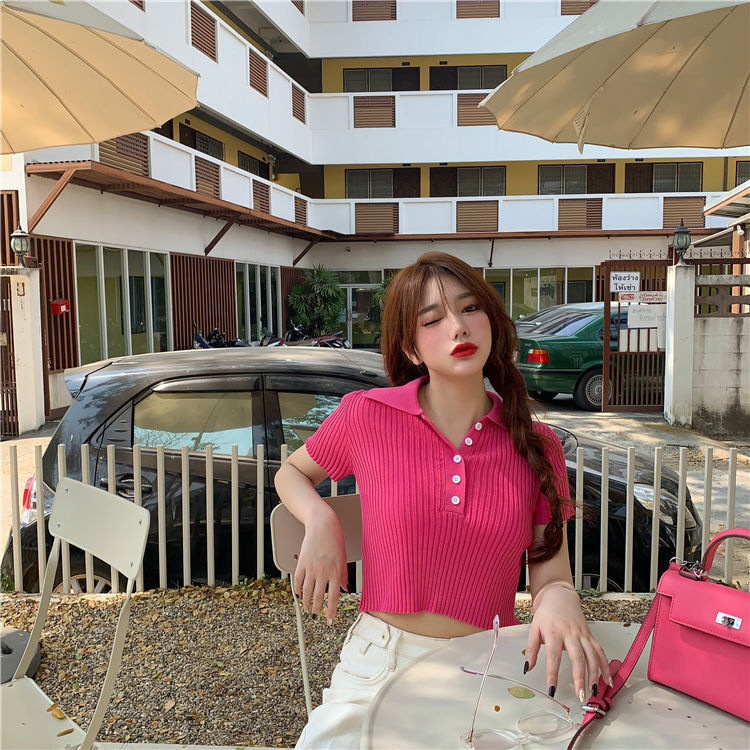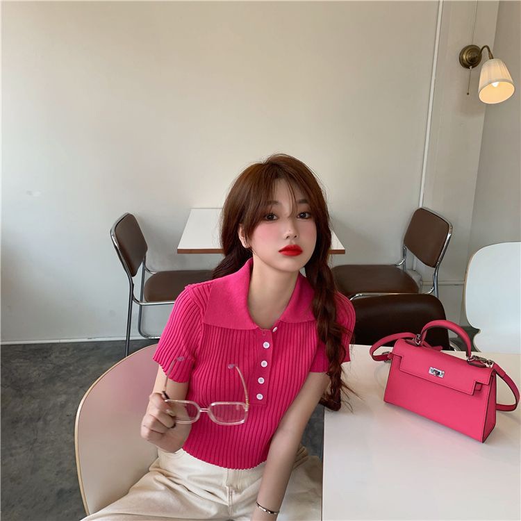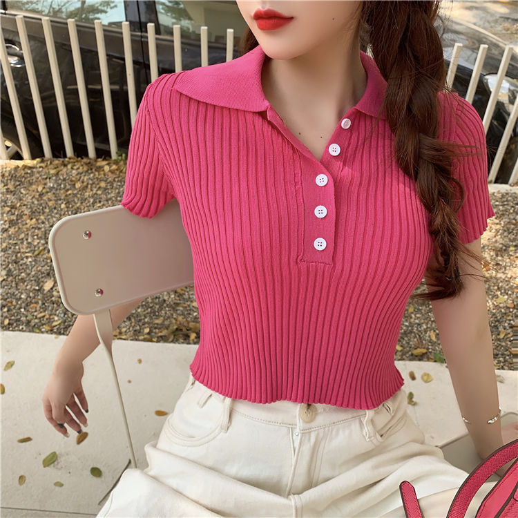 港味polo翻领短袖针织衫t恤女2021夏季新款显瘦短款学生打底上衣