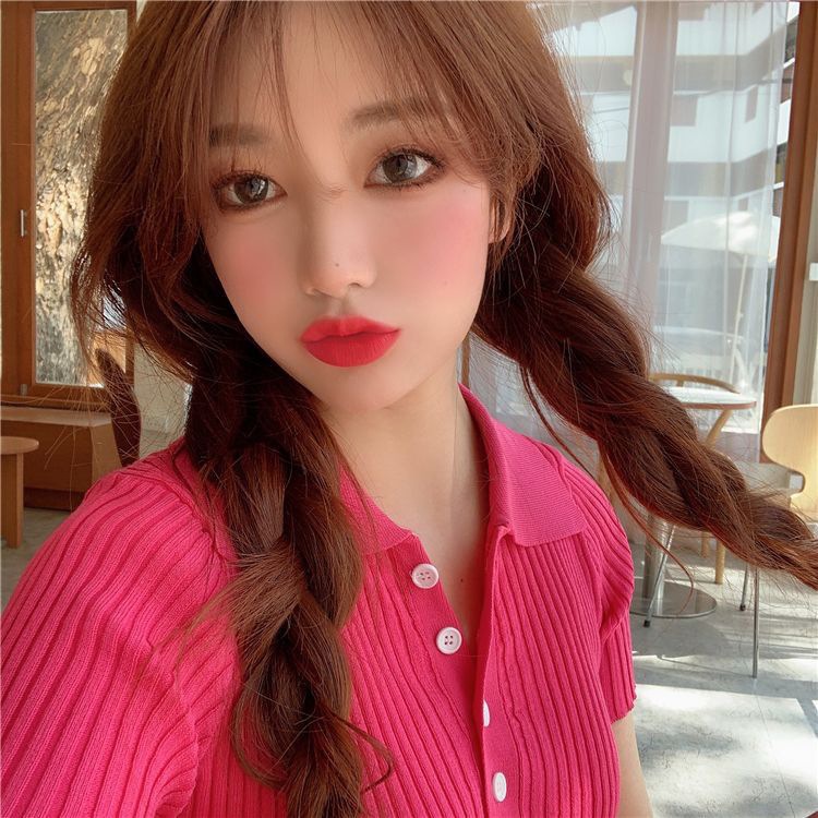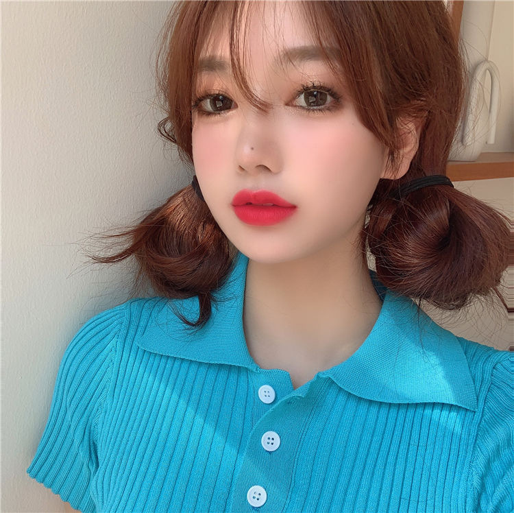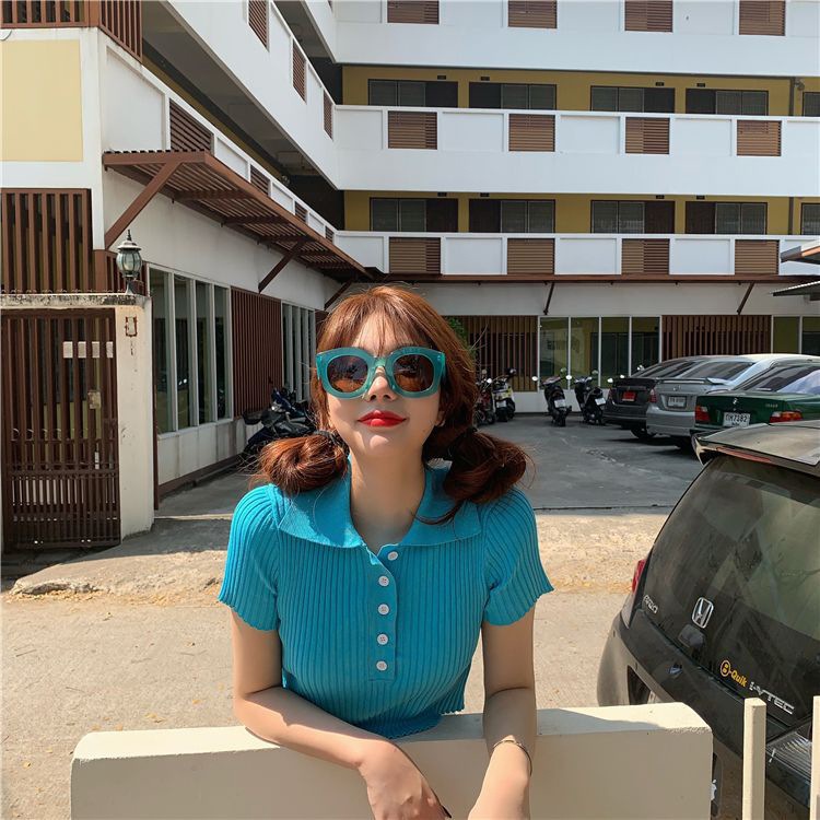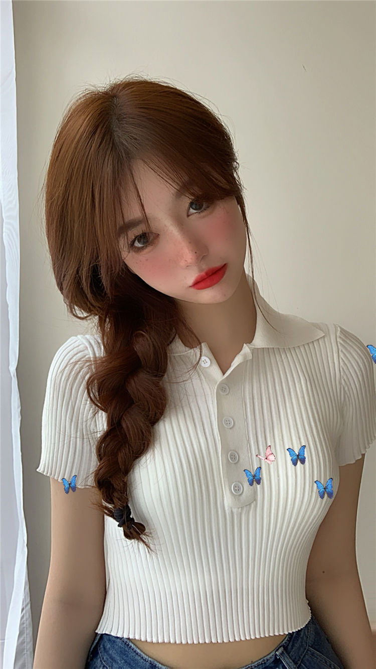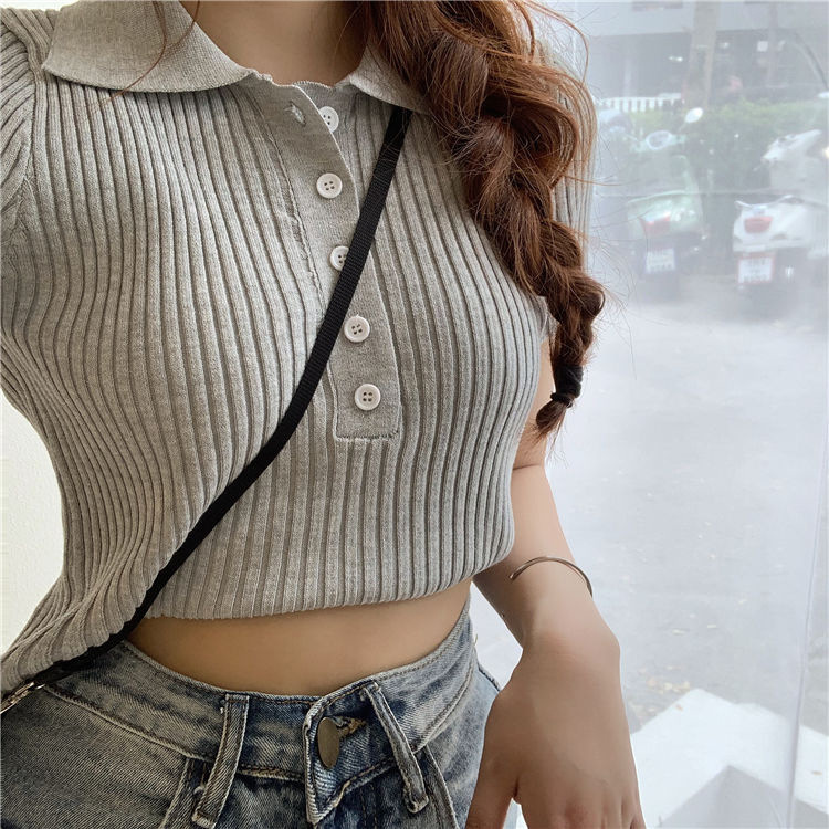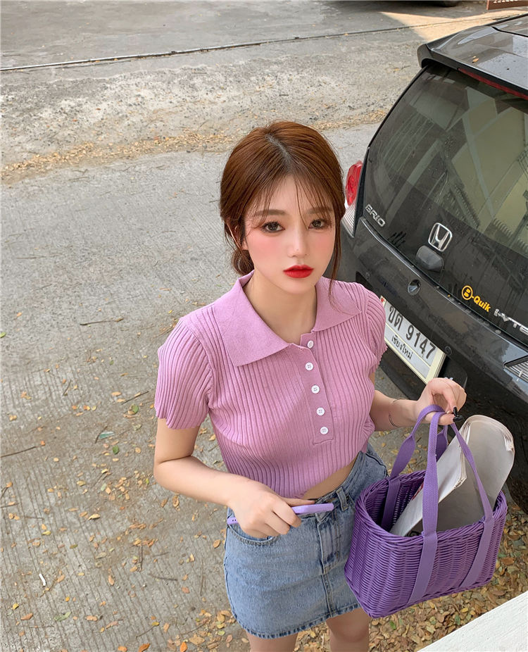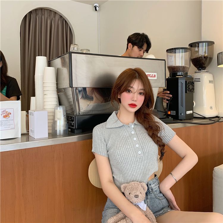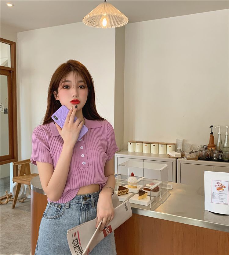 港味polo翻领短袖针织衫t恤女2021夏季新款显瘦短款学生打底上衣
