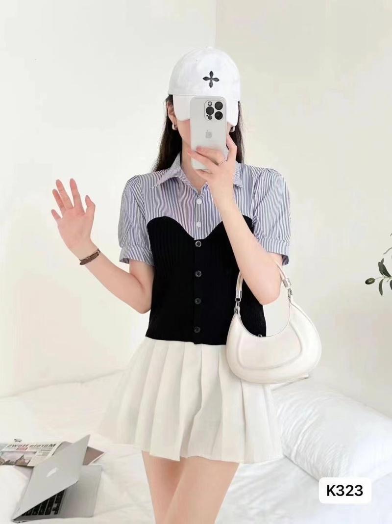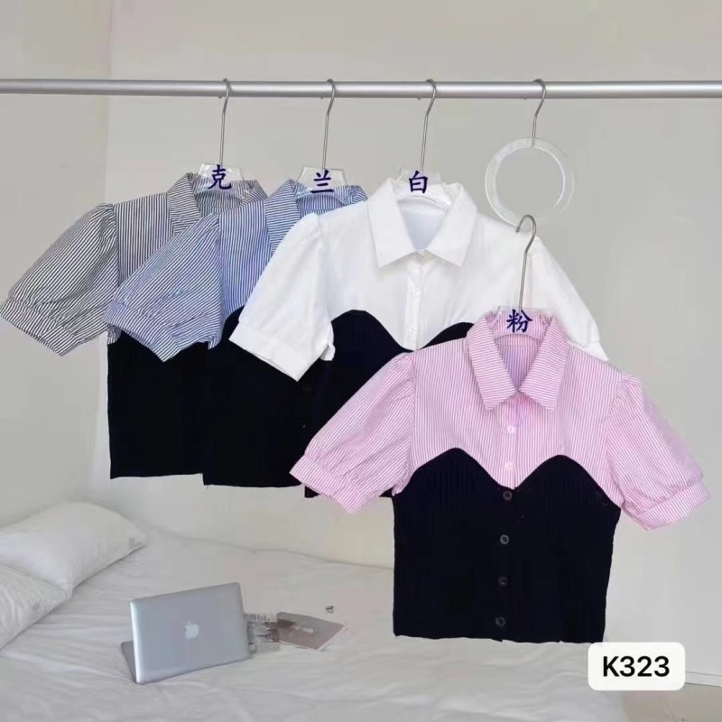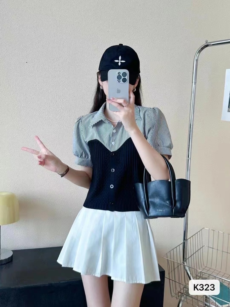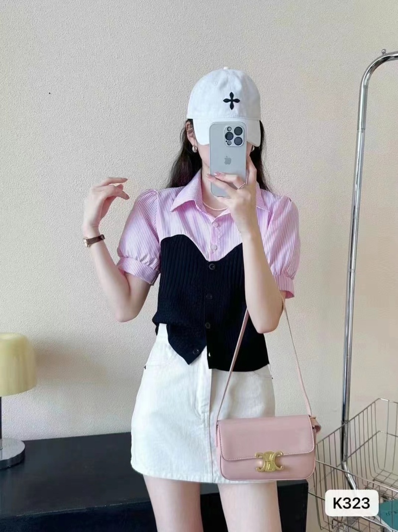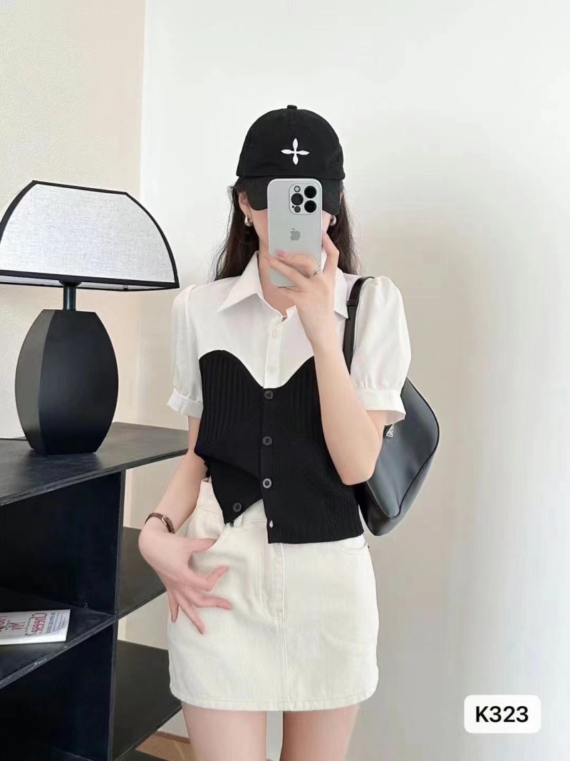 2023夏季新款韩版时尚气质优雅衬衣领拼接短袖开衫假两件上衣女潮