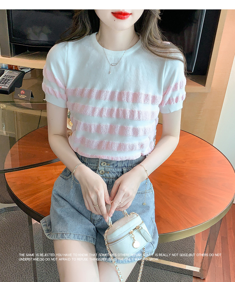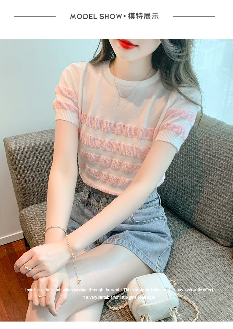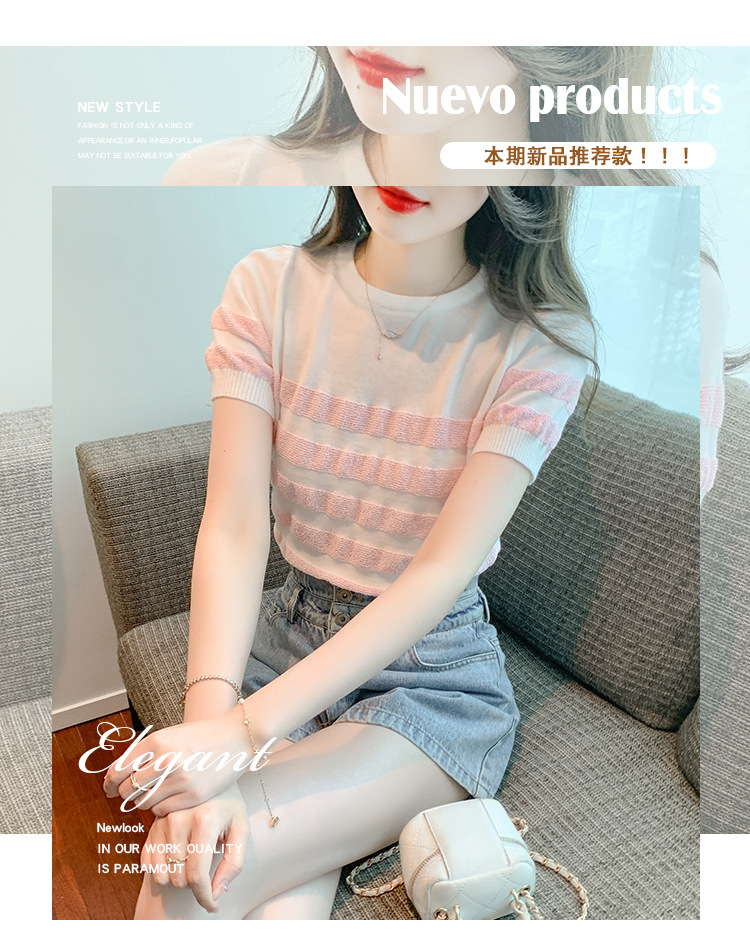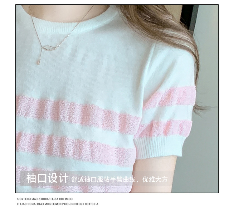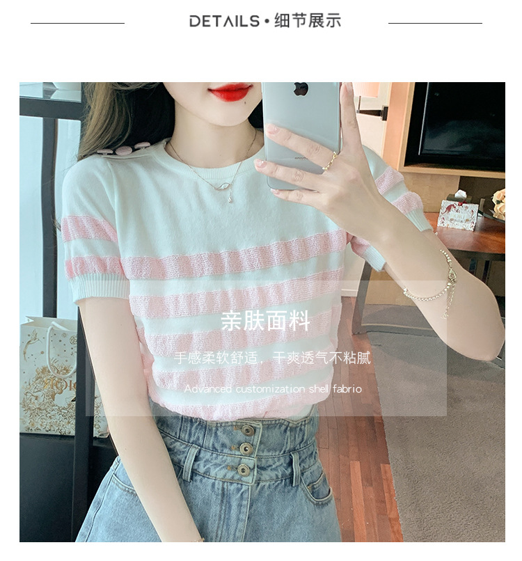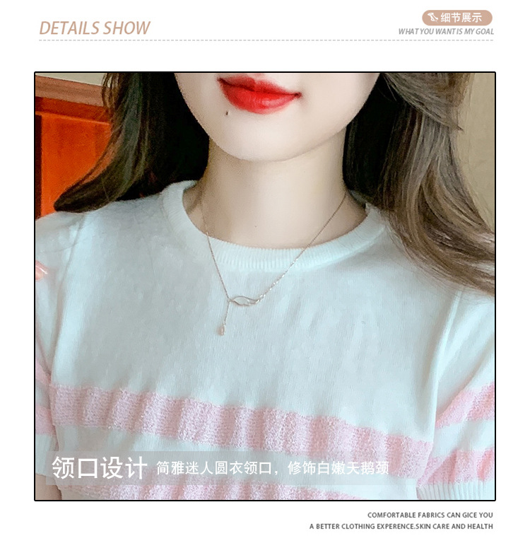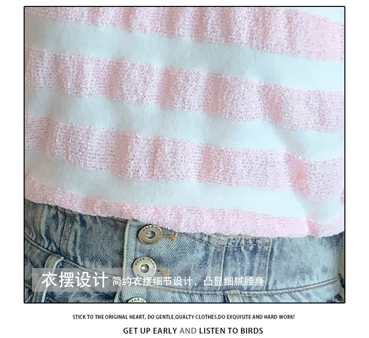 2023夏季新款韩版小清新短信上衣修身时尚条纹T恤女打底针织衫