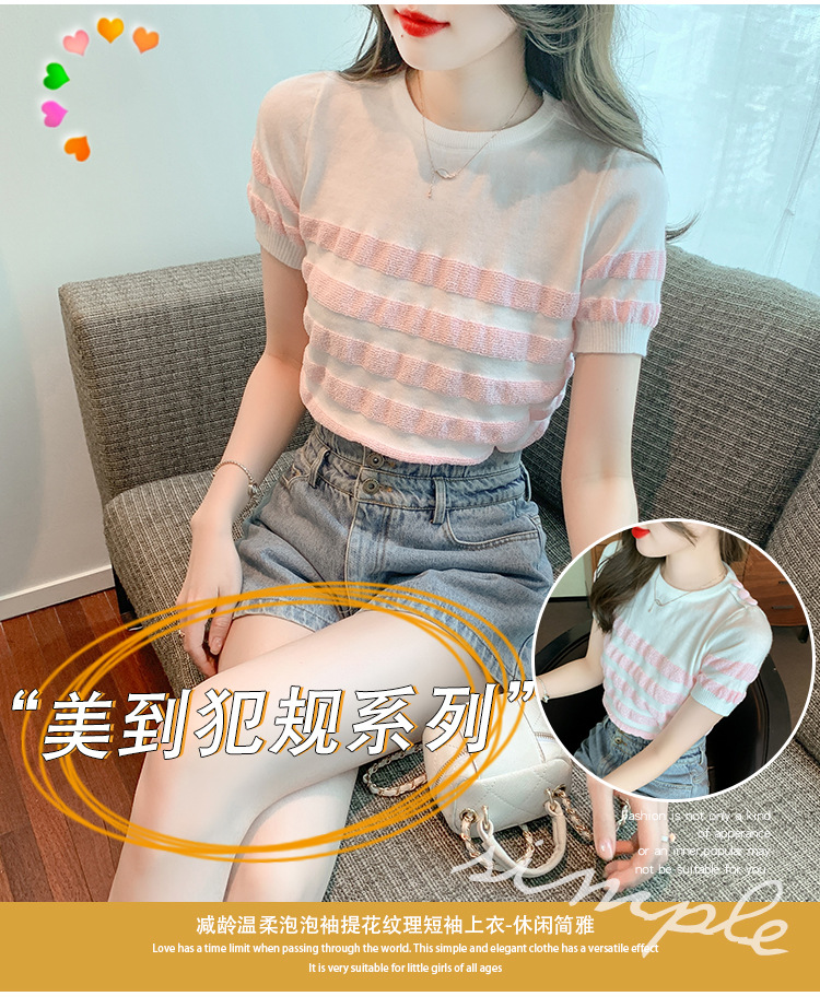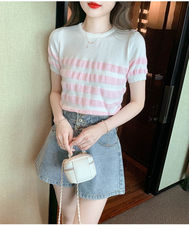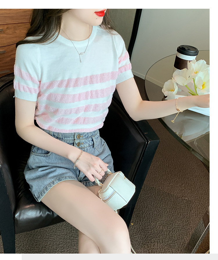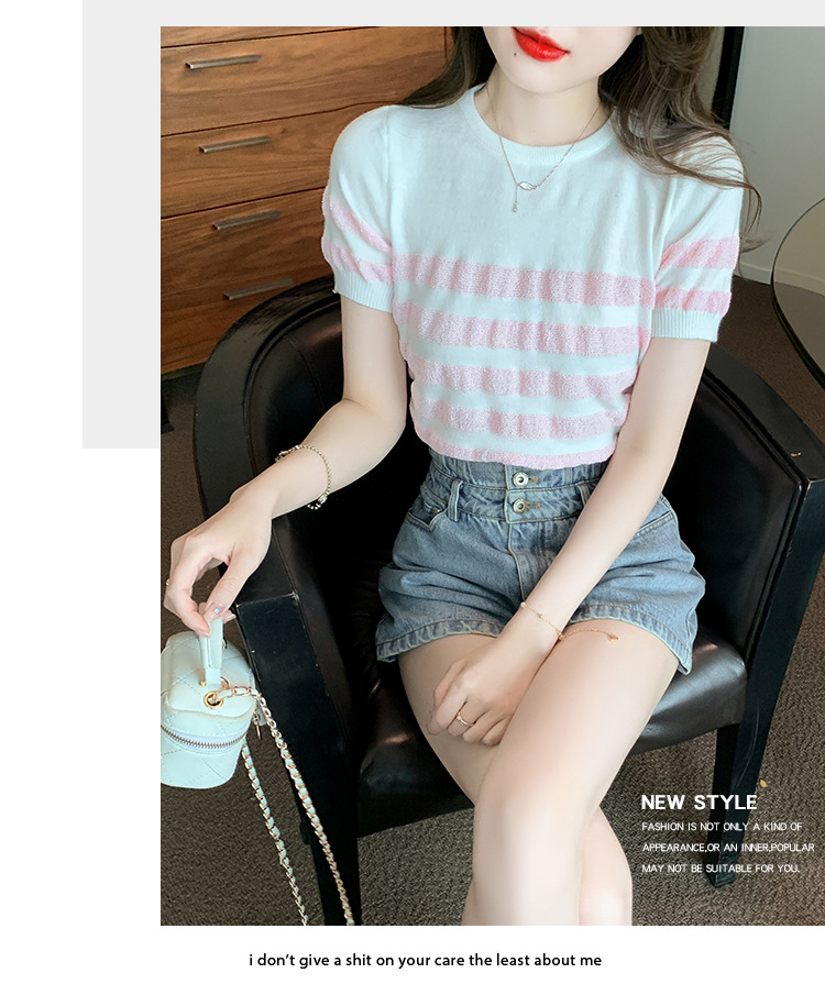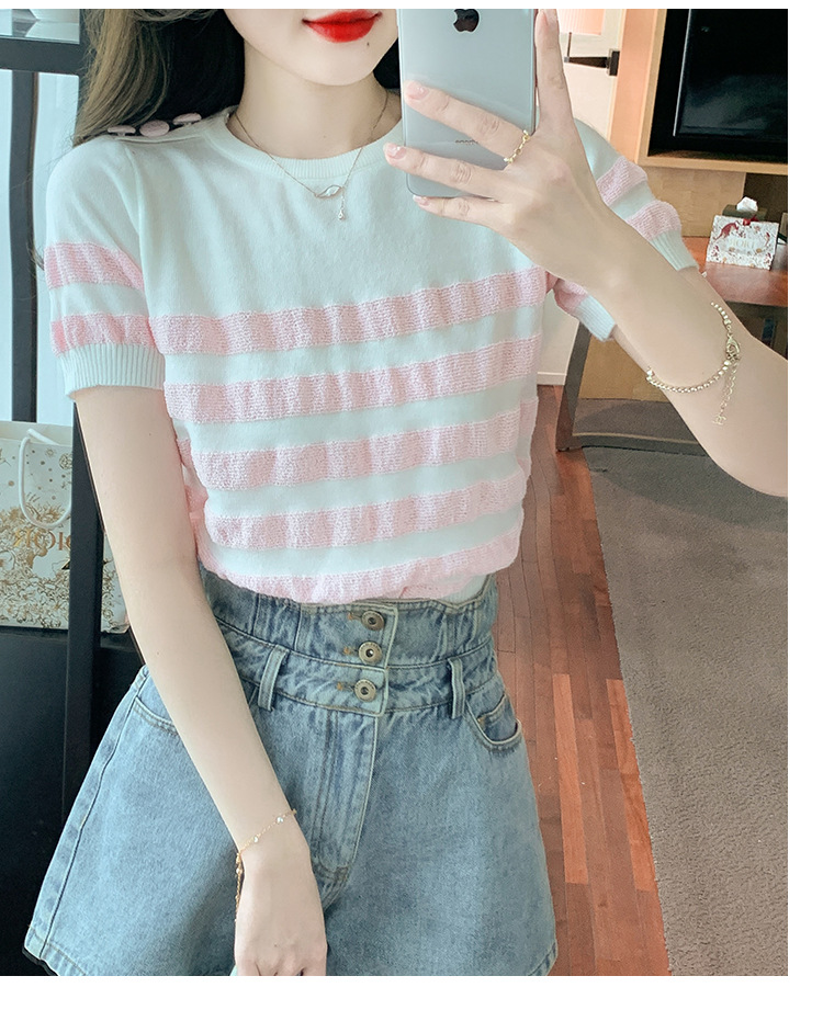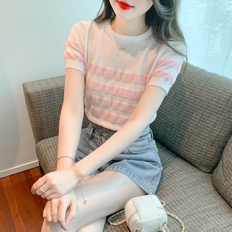 2023夏季新款韩版小清新短信上衣修身时尚条纹T恤女打底针织衫