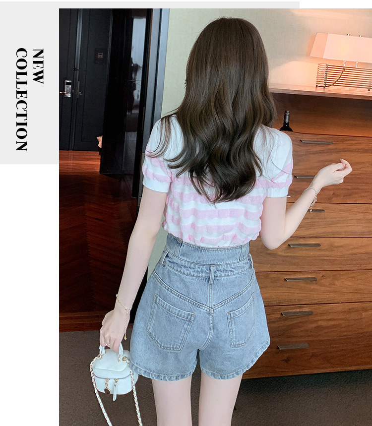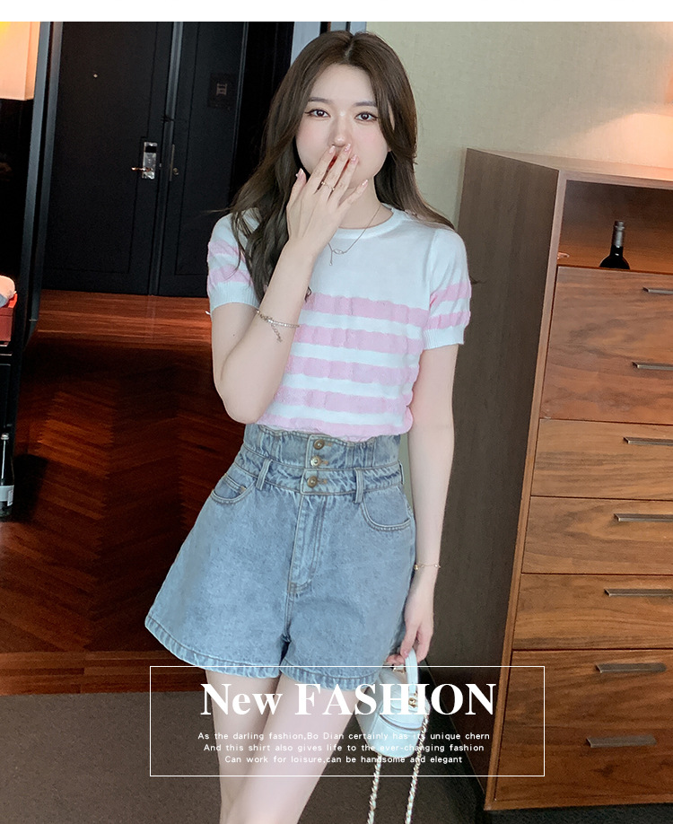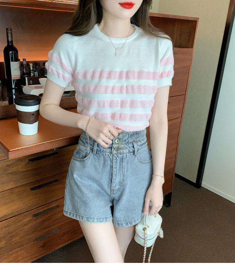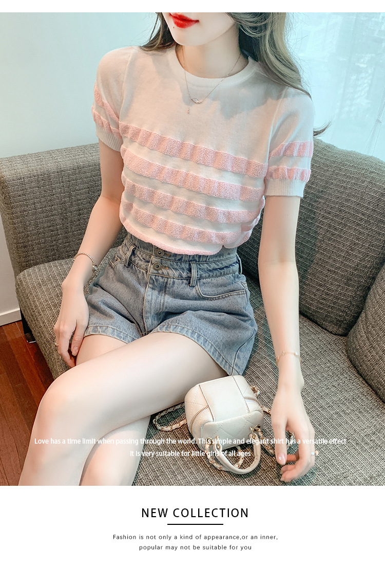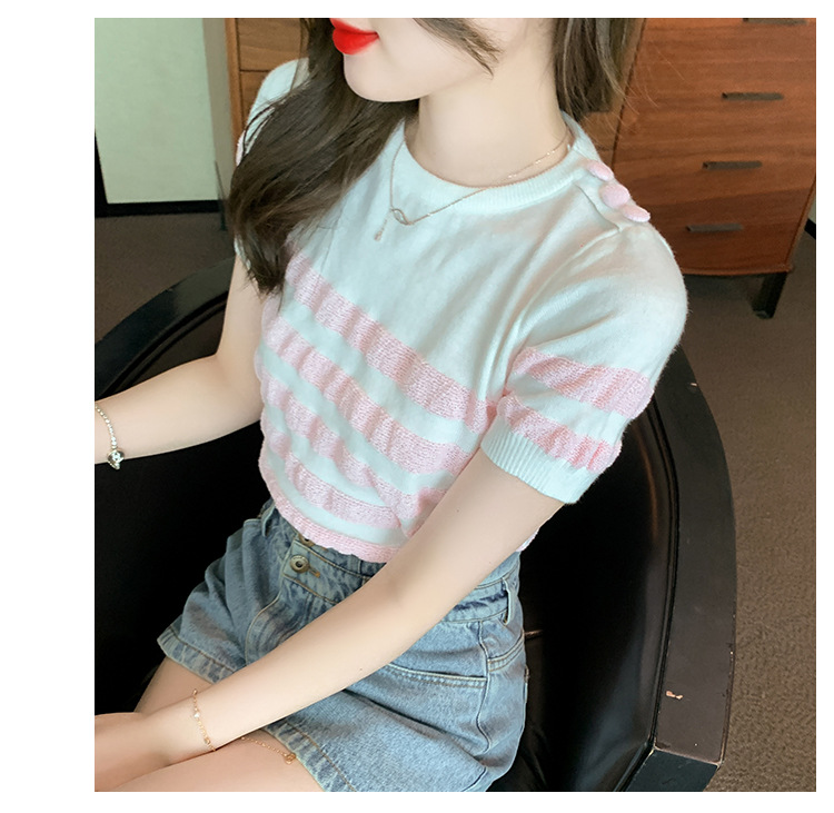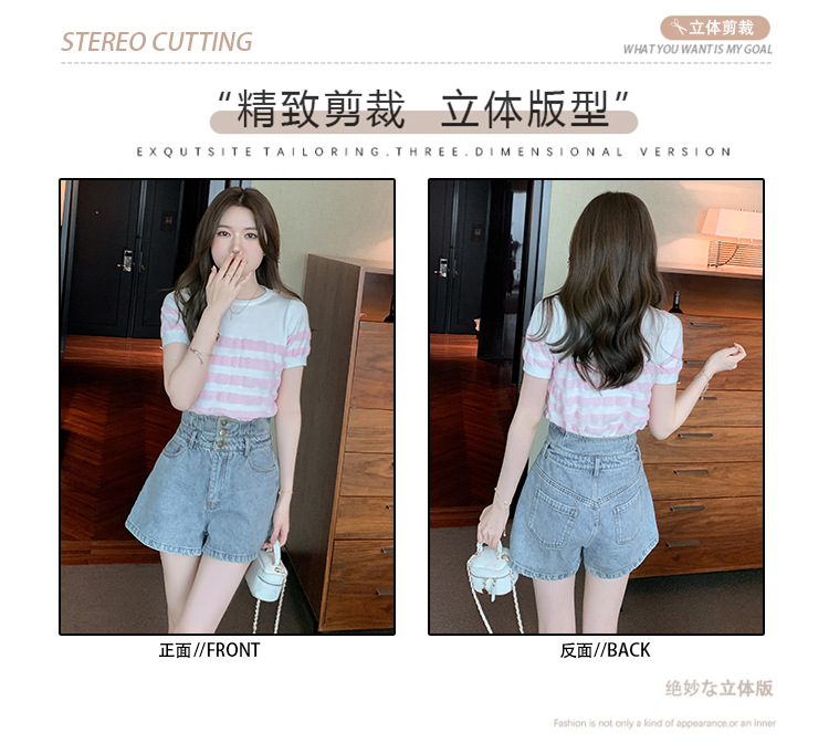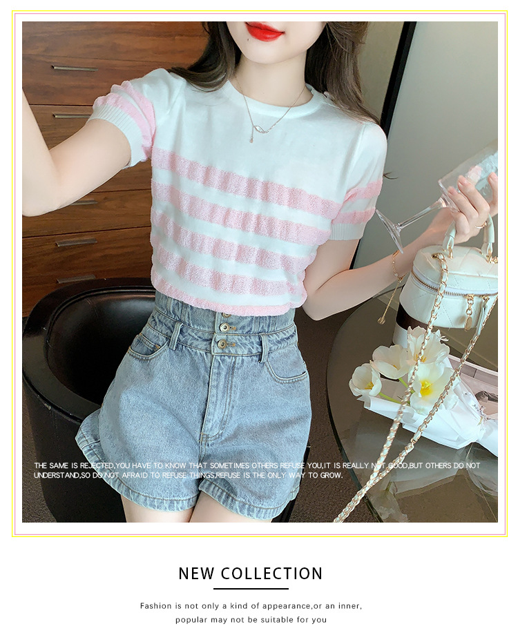 2023夏季新款韩版小清新短信上衣修身时尚条纹T恤女打底针织衫