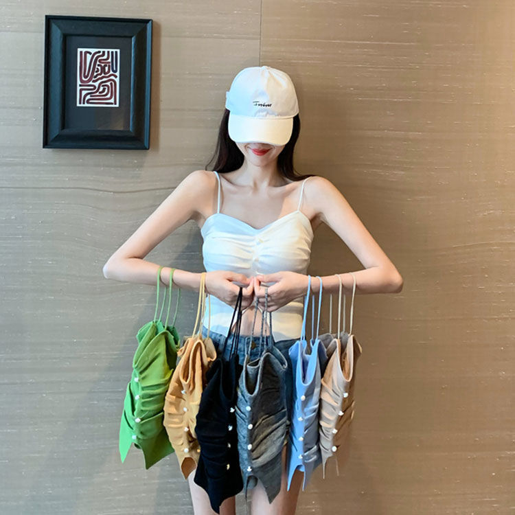 夏季复古简约显身材松紧褶皱短款吊带外穿性感针织打底小背心内搭