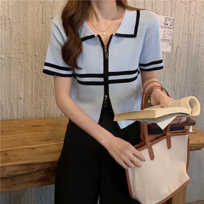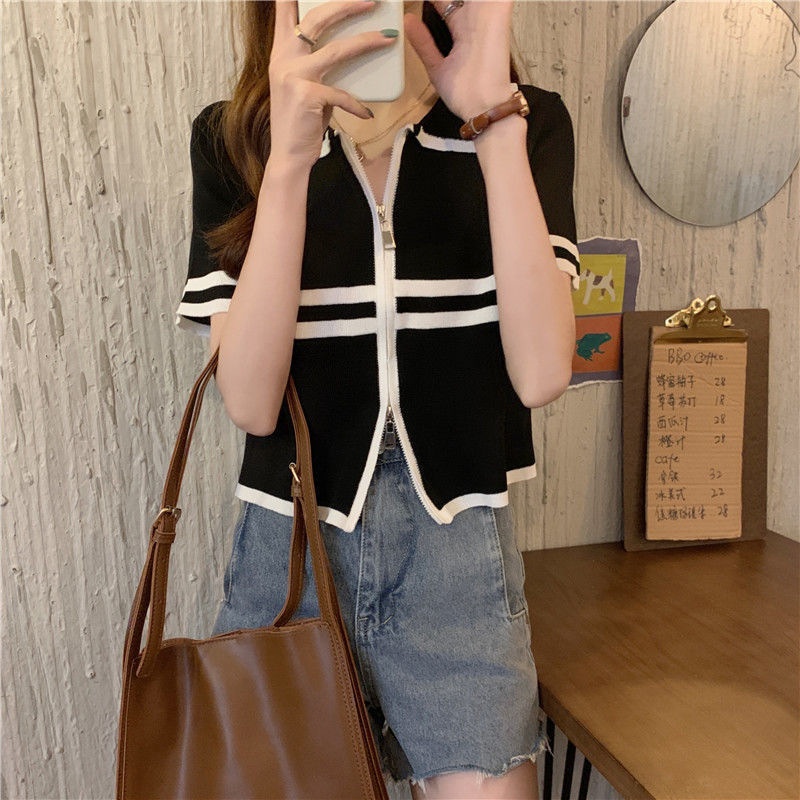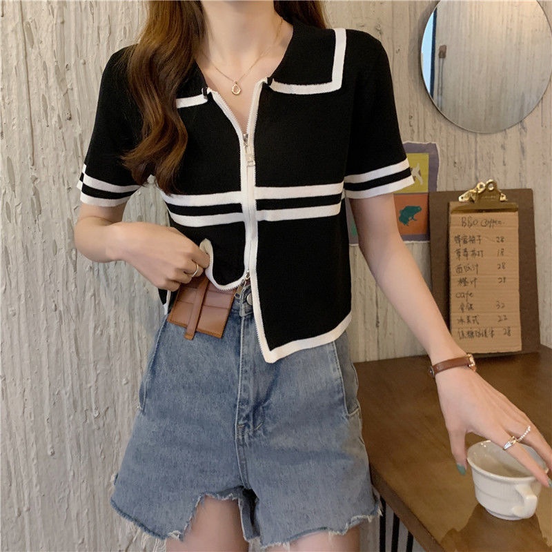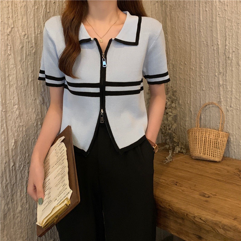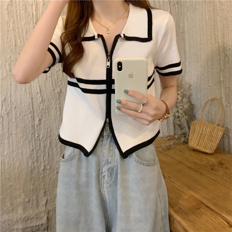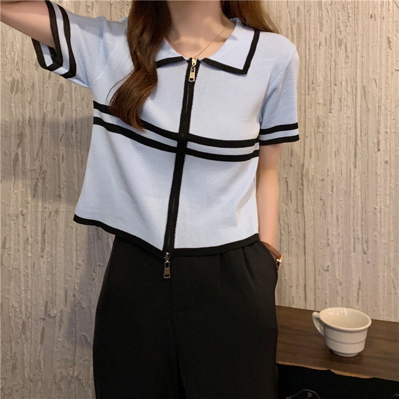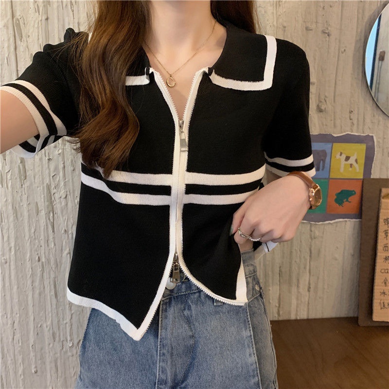 2023新款甜酷上衣女夏设计感小众T恤薄款潮双头拉链翻领针织体恤