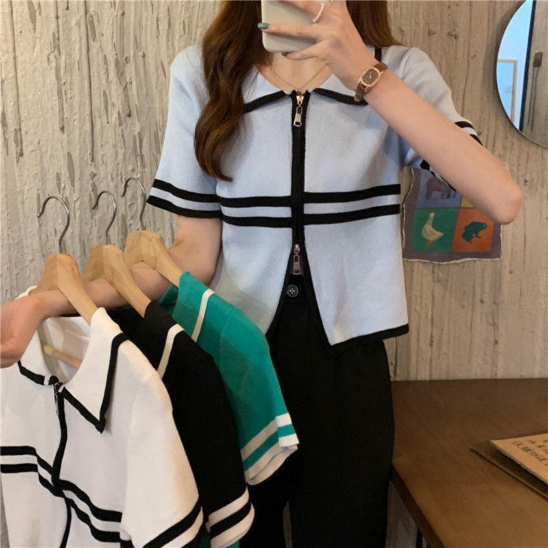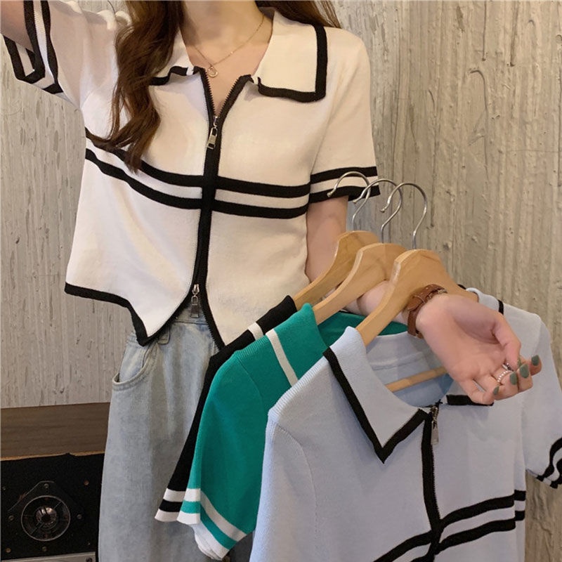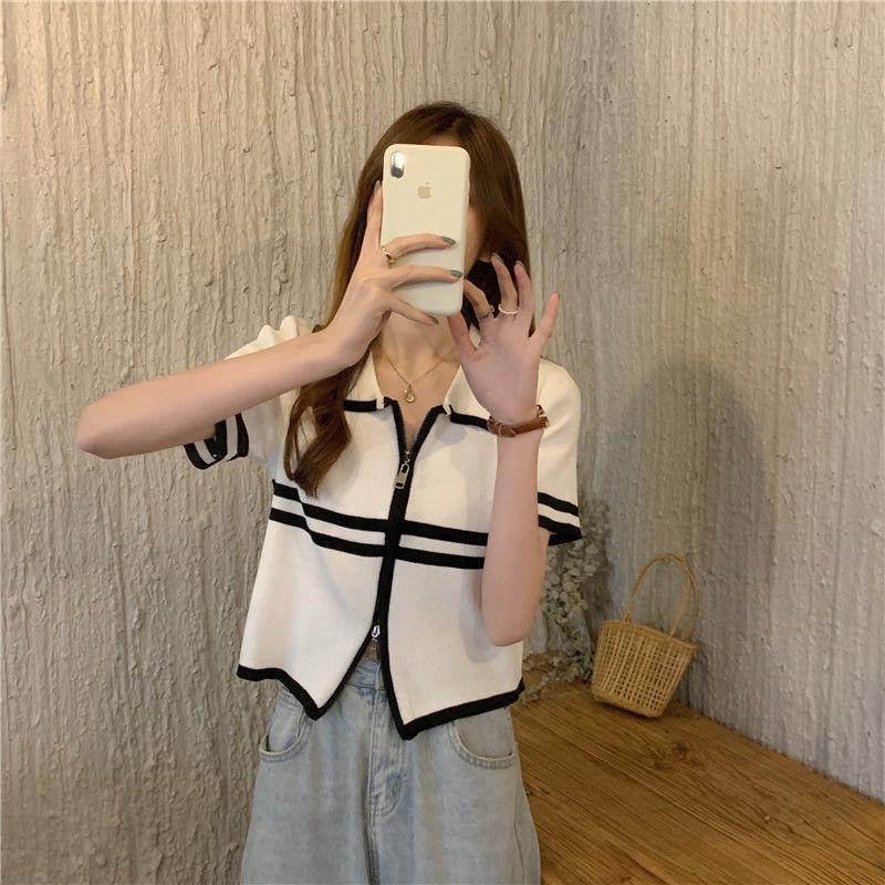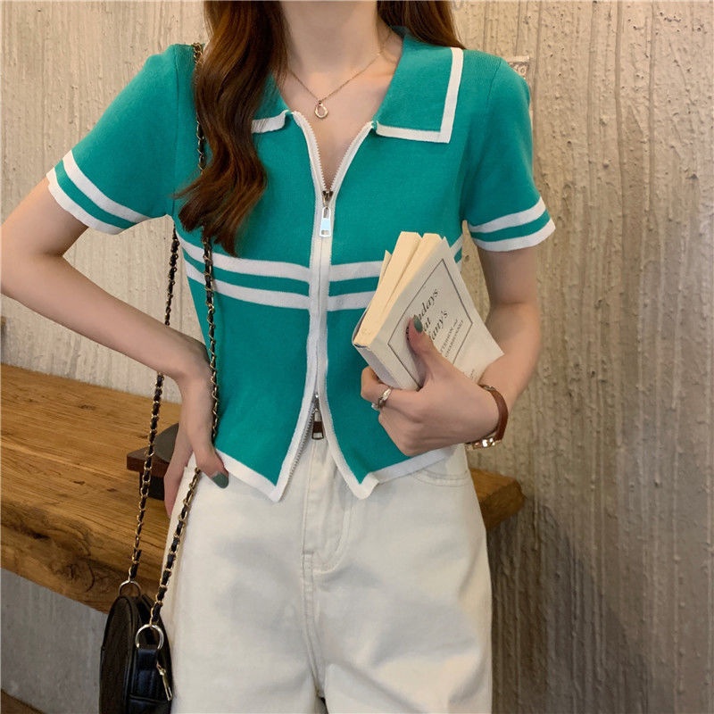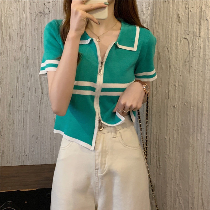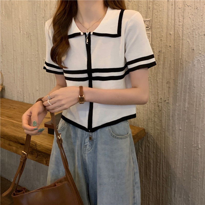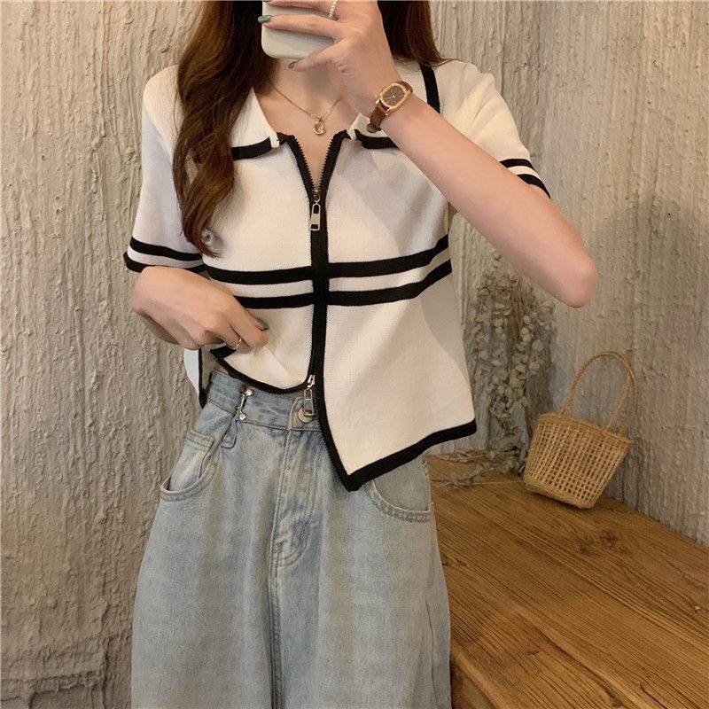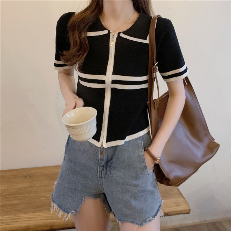 2023新款甜酷上衣女夏设计感小众T恤薄款潮双头拉链翻领针织体恤