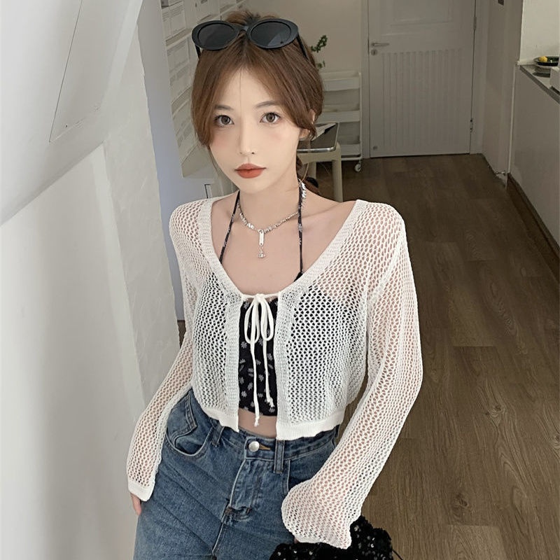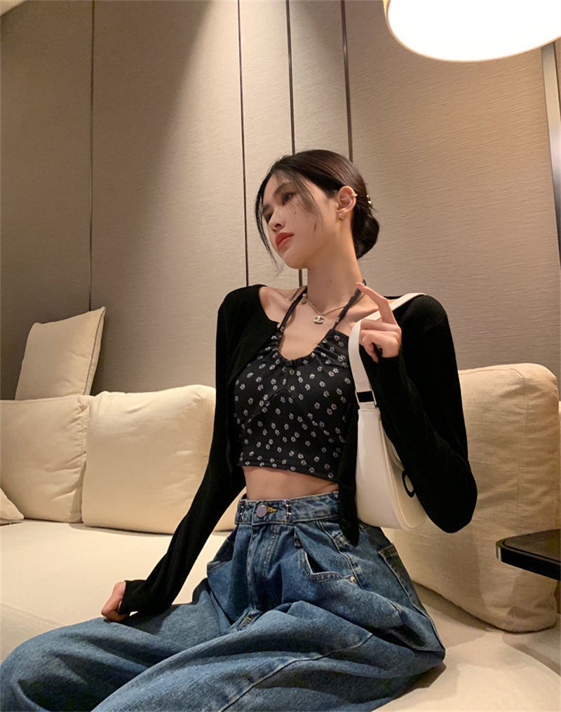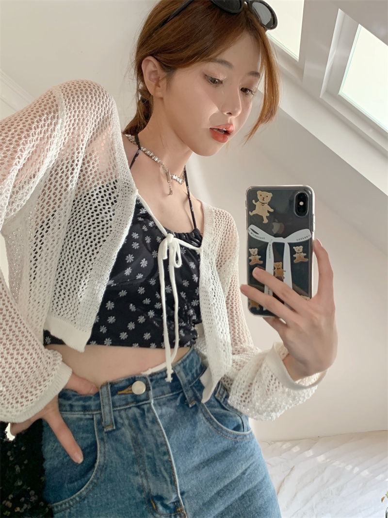 夏季新款甜辣妹镂空罩衫防晒外套针织开衫女碎花抹胸短款上衣套装