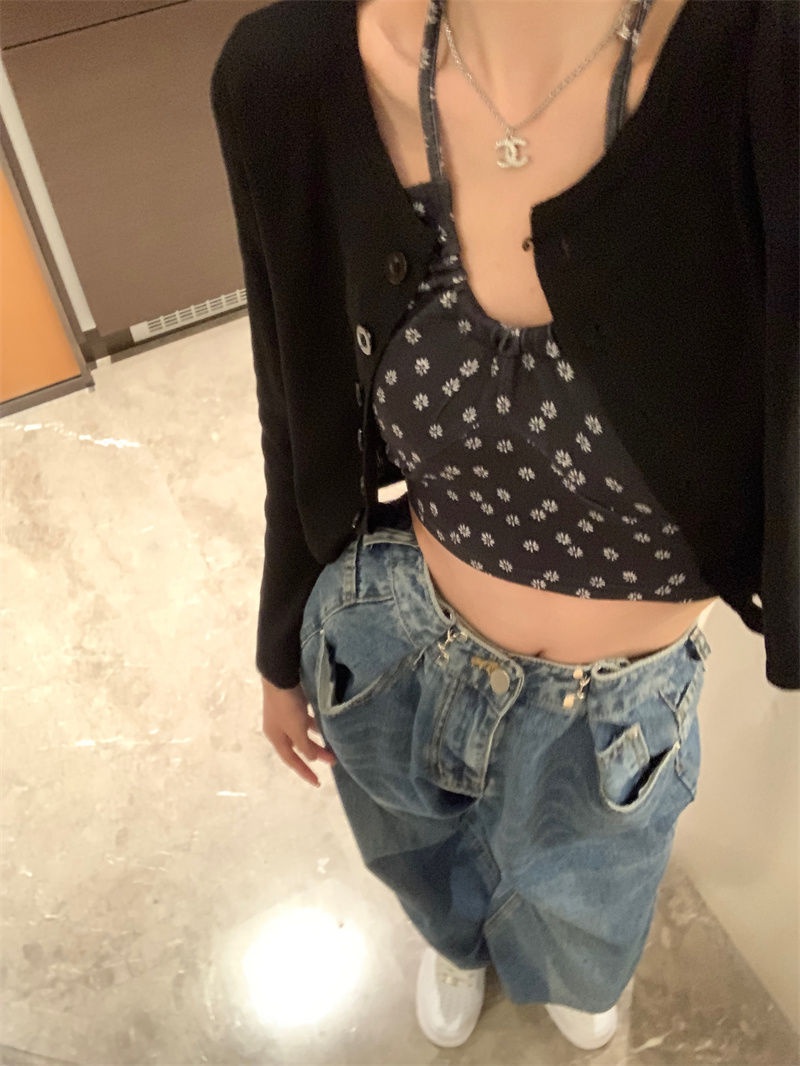 欧美腰果花复古吊带背心针织黑色抹胸美背外穿不规则辣妹上衣女夏