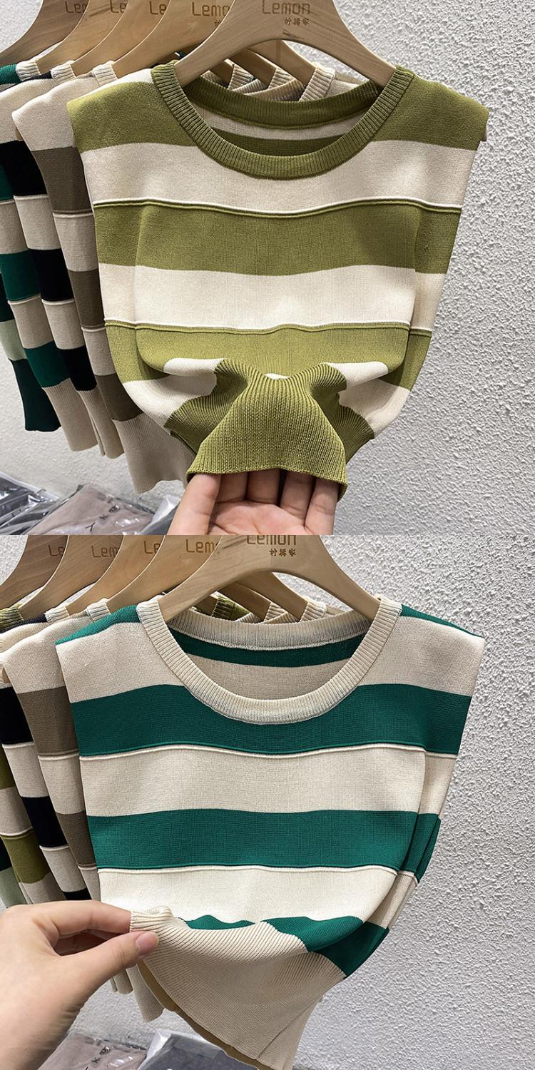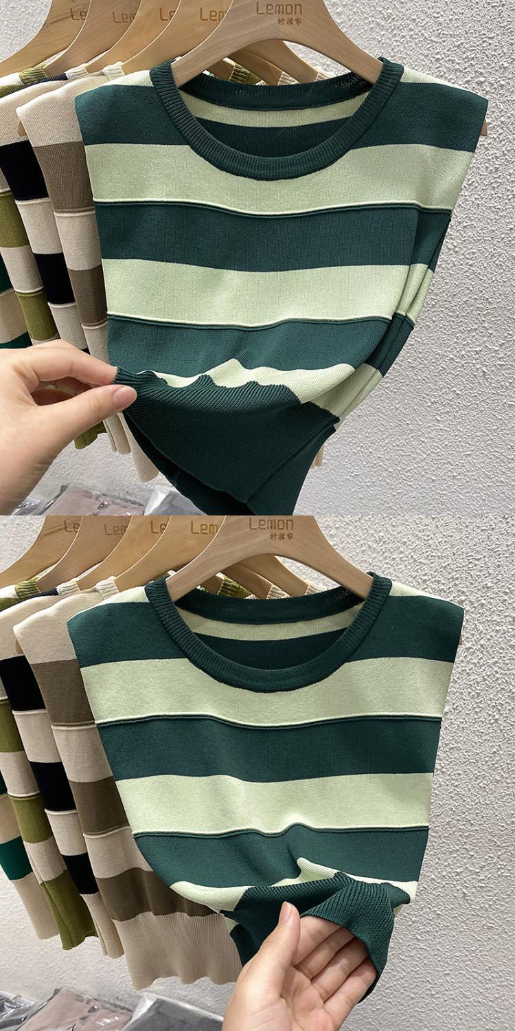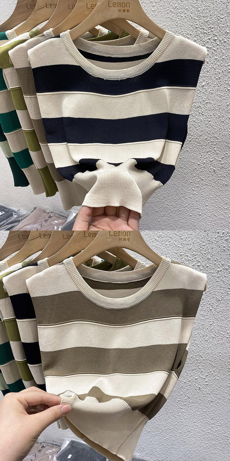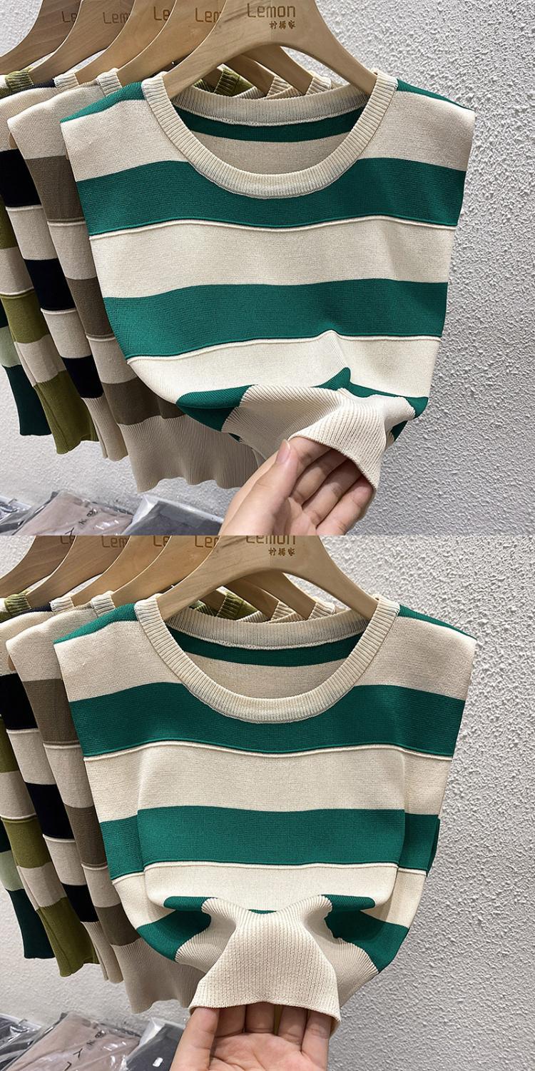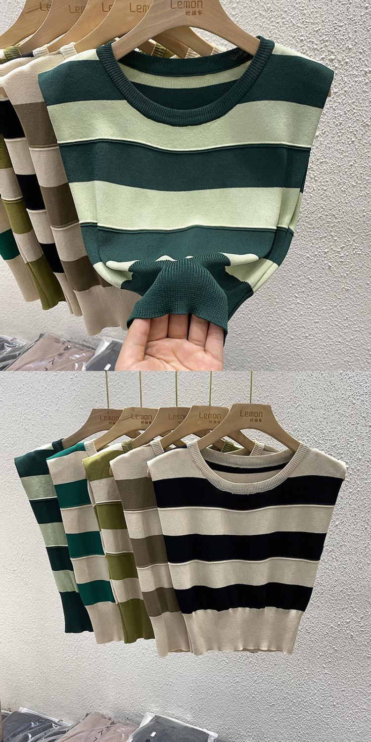 夏复古撞色修身马甲T恤短款冰丝坎肩上衣外穿条纹无袖针织背心女