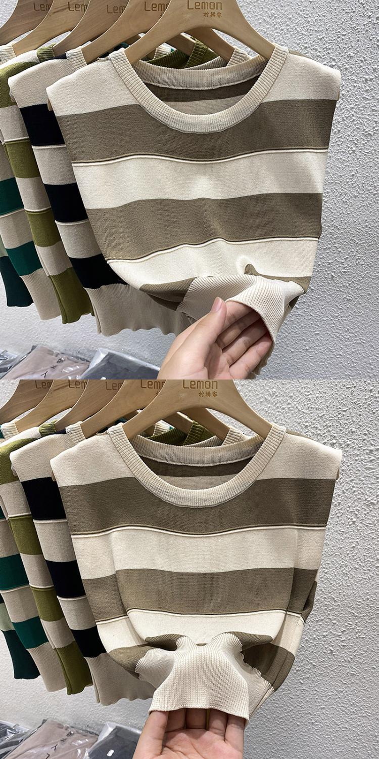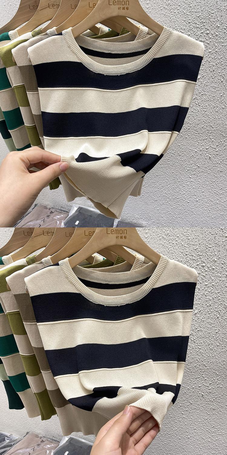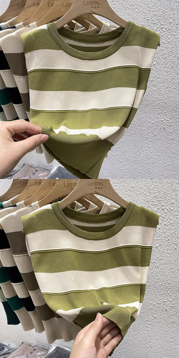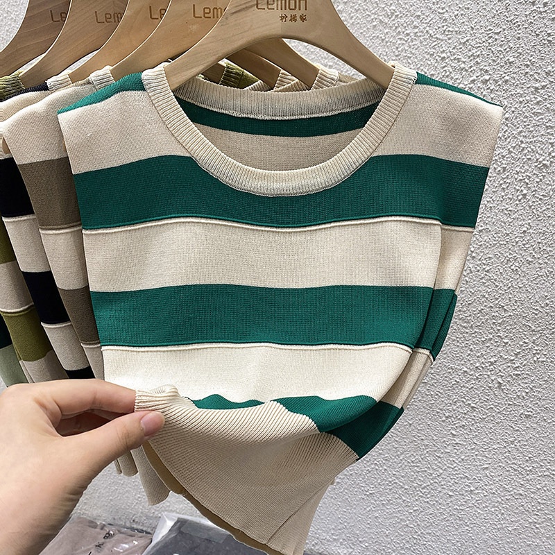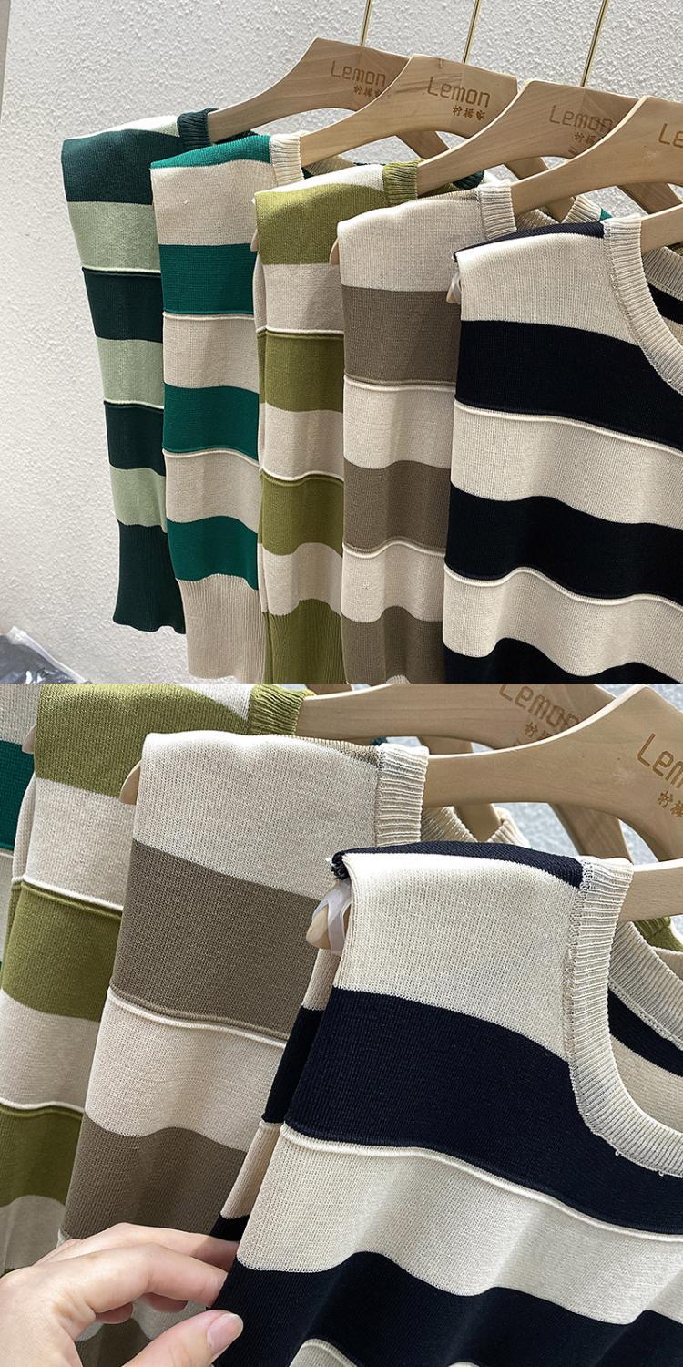 夏复古撞色修身马甲T恤短款冰丝坎肩上衣外穿条纹无袖针织背心女