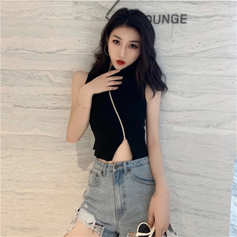 夏季女装chic内搭修身无袖T恤开叉上衣不规则半高领针织短款背心