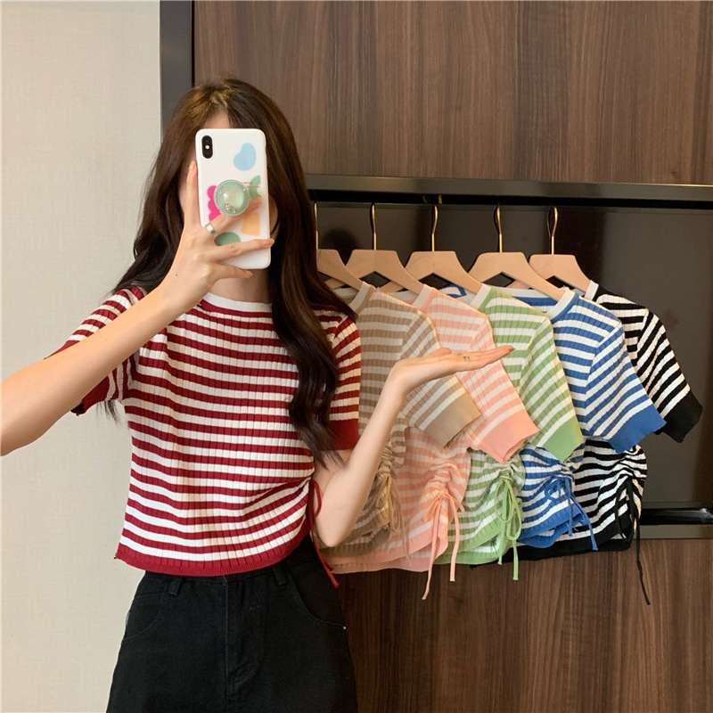 圆领抽绳撞色条纹针织衫上衣女夏季设计感修身绑带纯欲风短款上衣