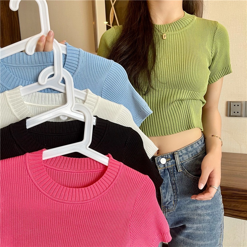 冰丝圆领针织短袖T恤女夏季2022新款韩版修身显瘦甜辣风短款上衣