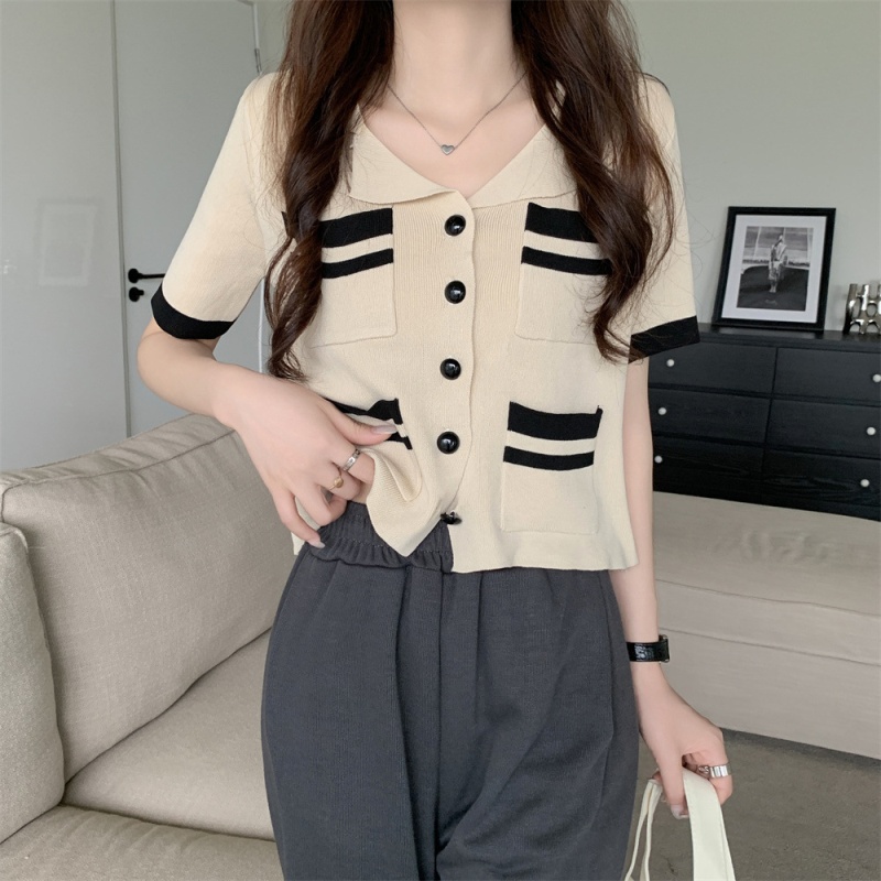 polo领撞色单排扣针织短袖T恤女设计感宽松显瘦小香风短款上衣潮