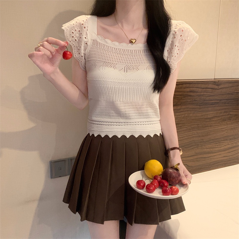 小飞袖方领镂空花边针织短袖T恤女夏季薄款冰丝法式修身短款上衣