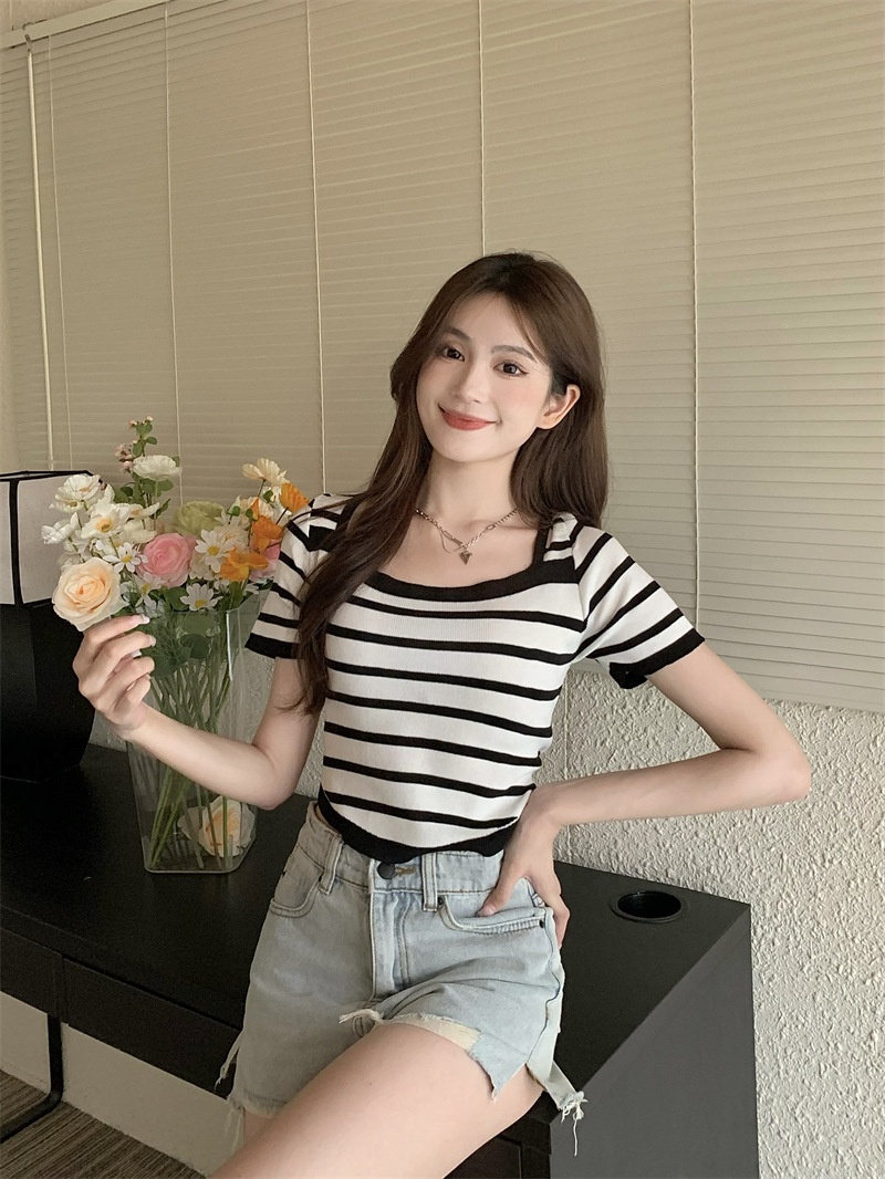 方领撞色条不规则短袖T恤女夏季新款修身显瘦别致短款针织上衣女