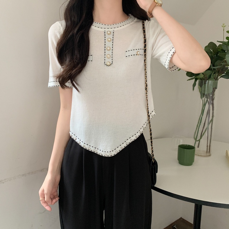 圆领不规则上衣女夏季小香风镶钻钉珠薄款宽松显瘦减龄短袖T恤女