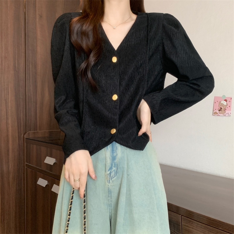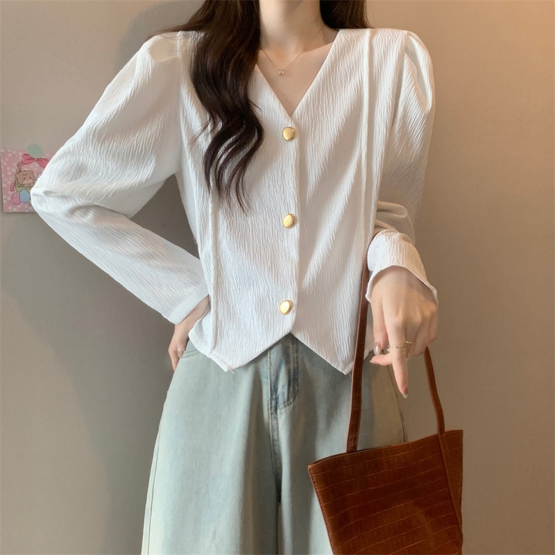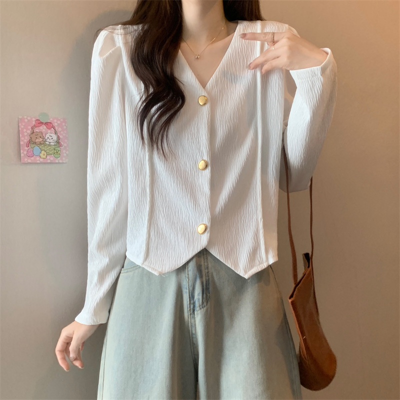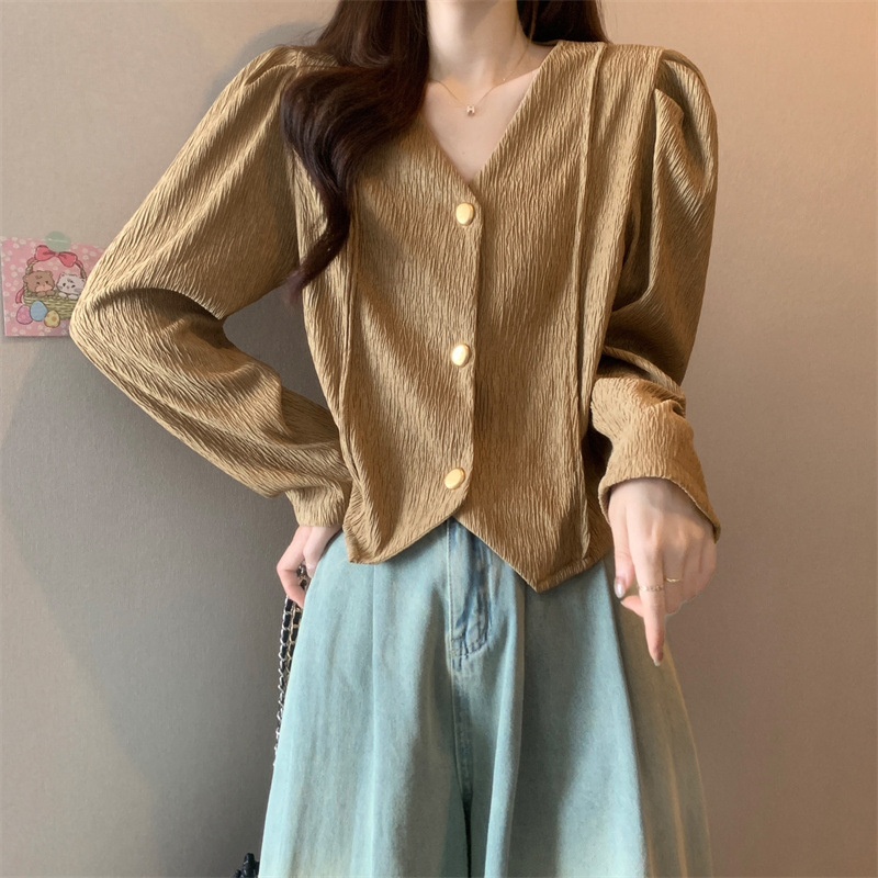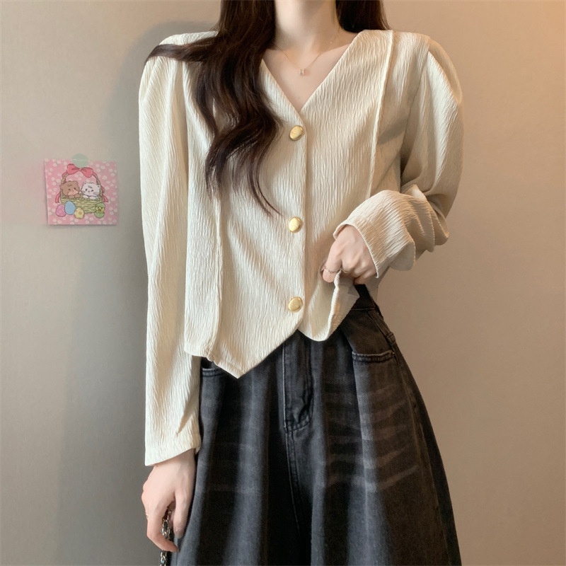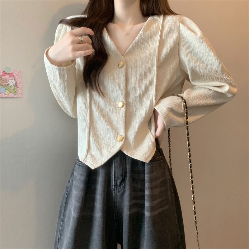 2024春秋季新款法式V领长袖衬衫女洋气百搭小众别致泡泡袖上衣潮