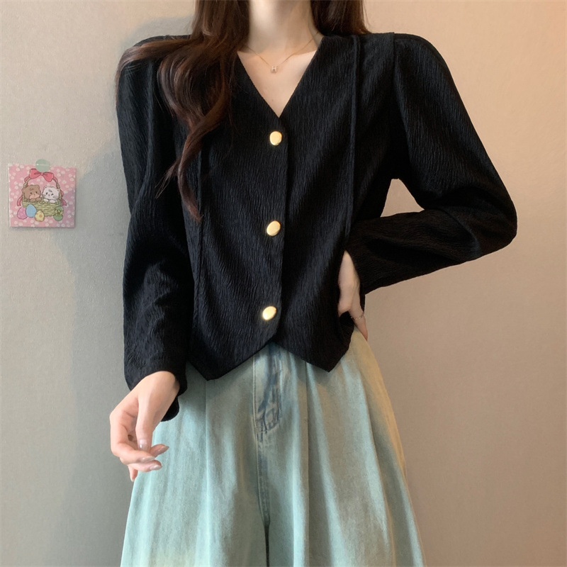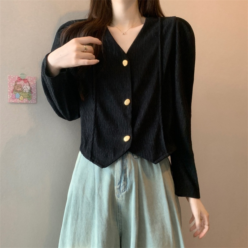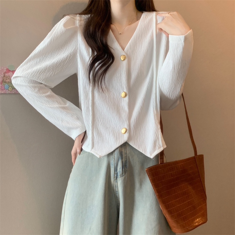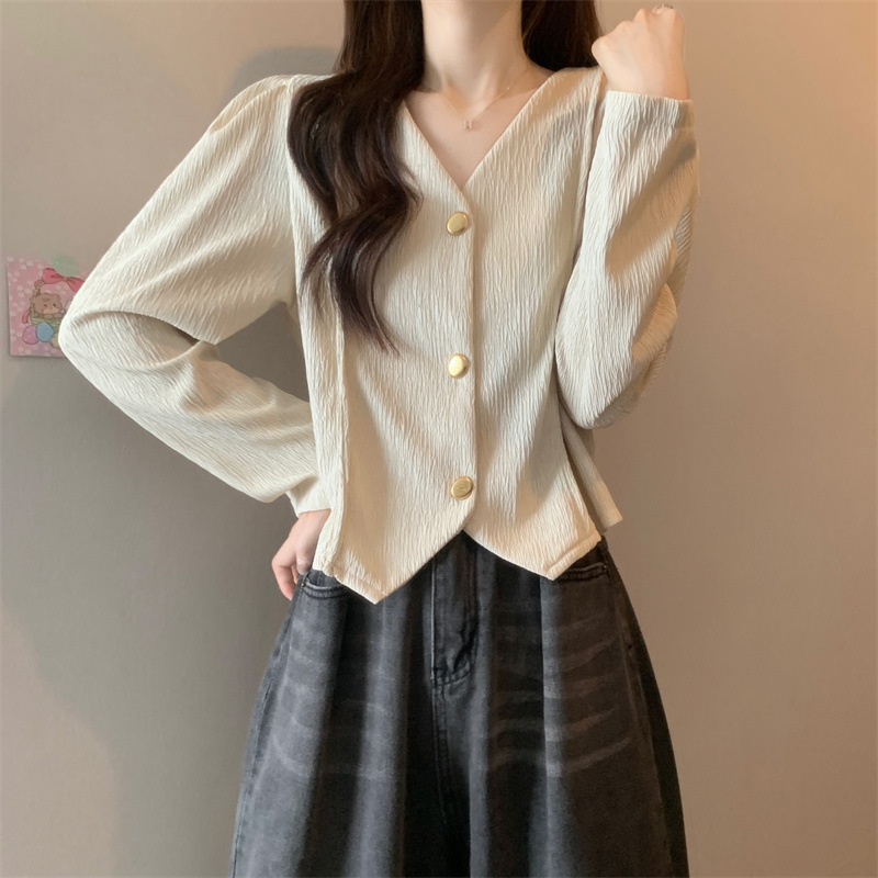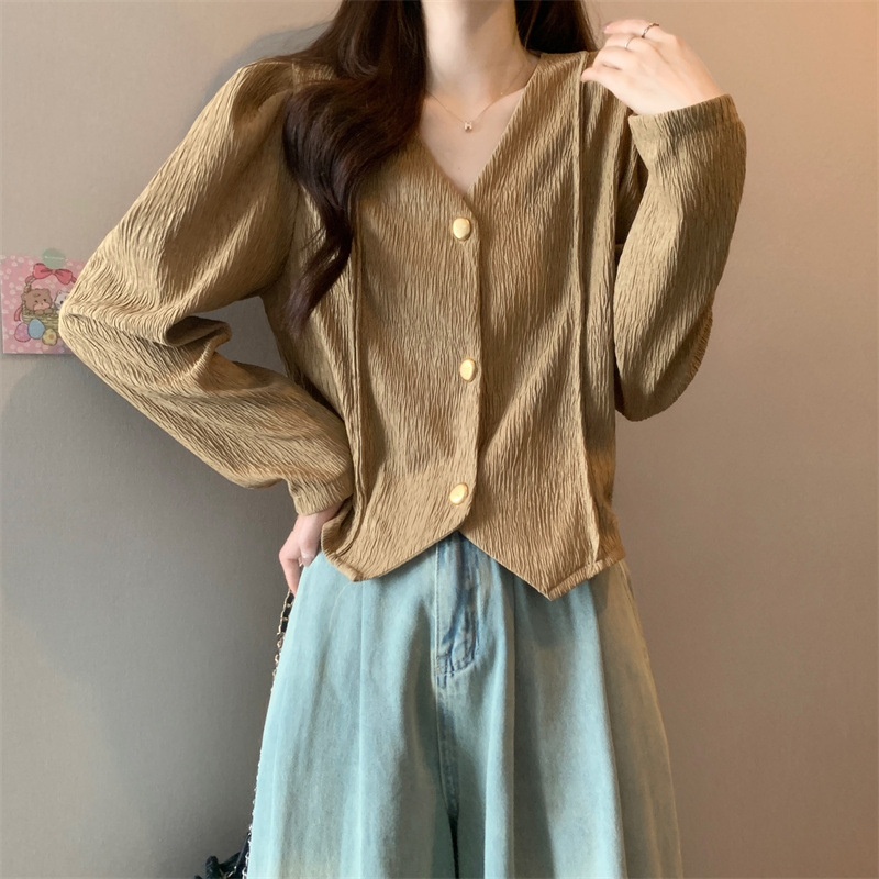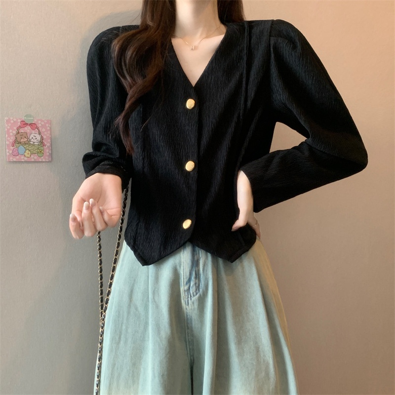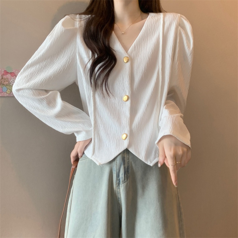 2024春秋季新款法式V领长袖衬衫女洋气百搭小众别致泡泡袖上衣潮