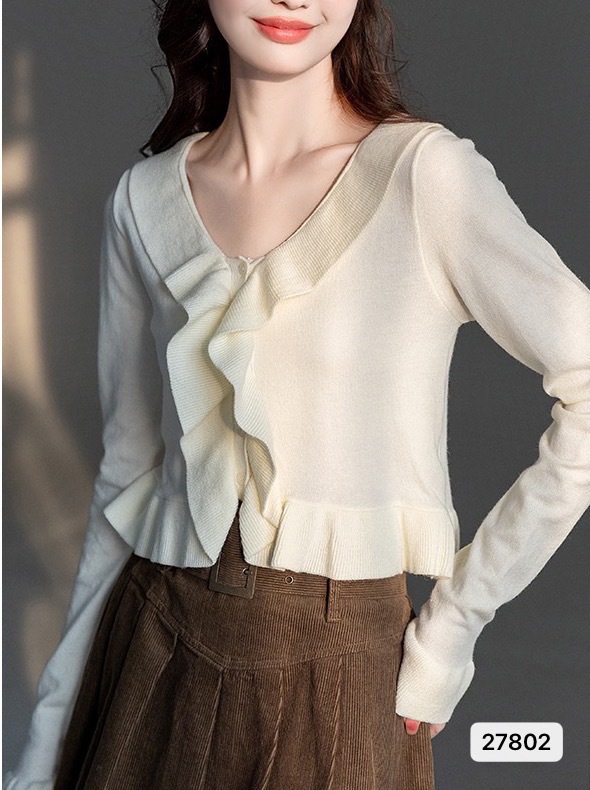 2023新款纯欲荷叶边喇叭袖针织衫女秋冬季长袖内搭短款打底衫上衣