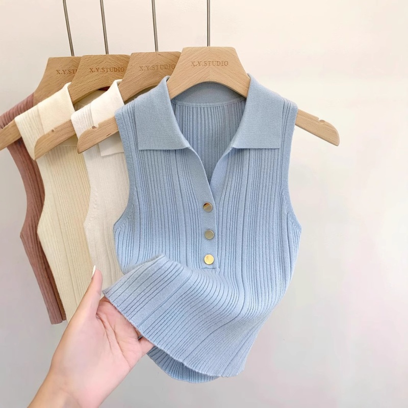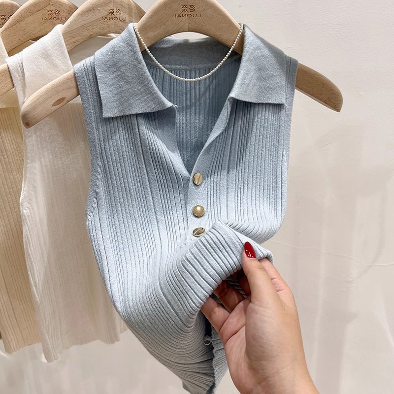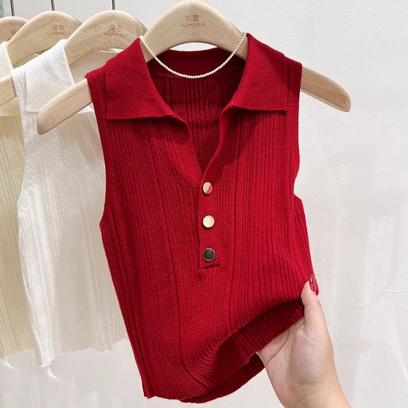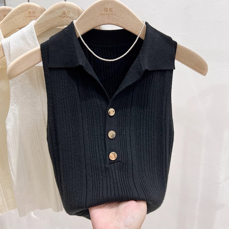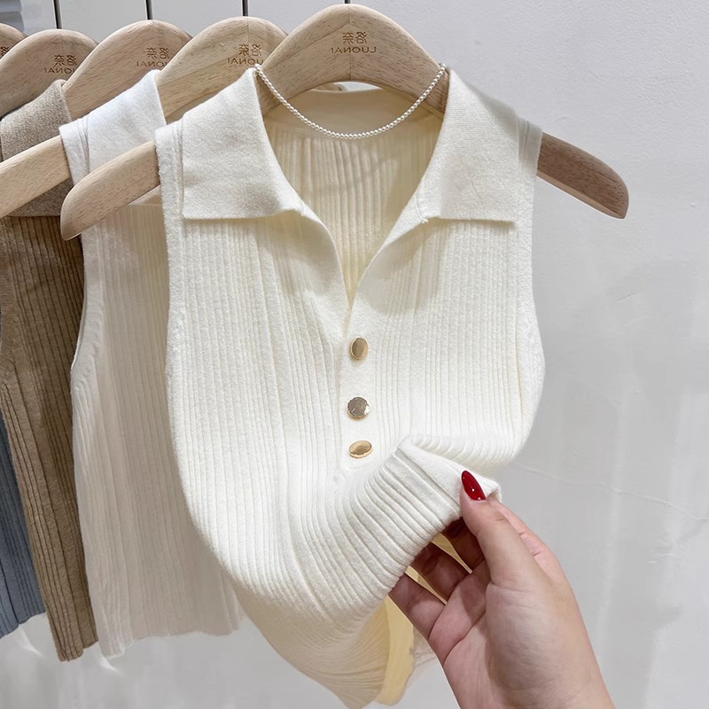 2025春季小香风金扣Polo领针织背心女法式无袖独特别致修身上衣潮