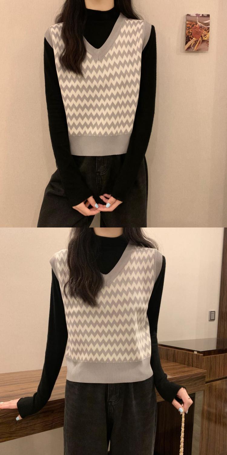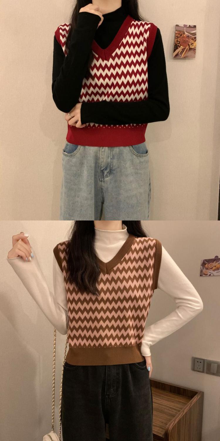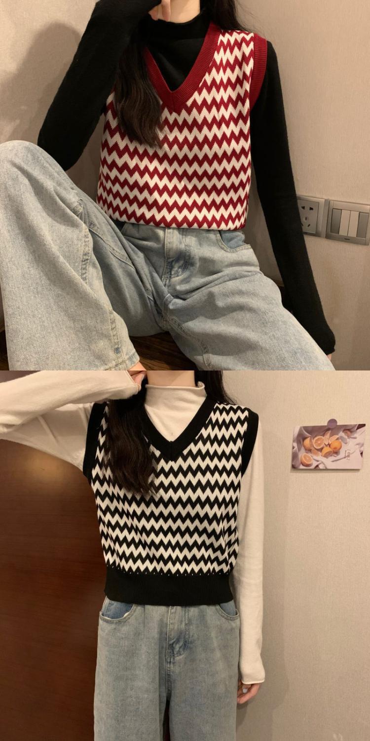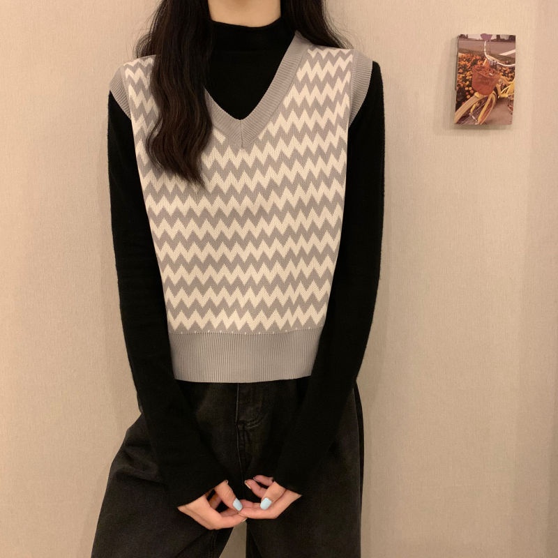 条纹针织马甲女秋冬外搭短款马夹小背心叠穿休闲百搭无袖坎肩毛衣