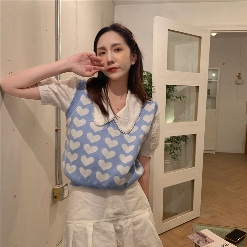 2022秋季韩版学院风爱心马甲撞色V领无袖显瘦百搭小外套针织上衣