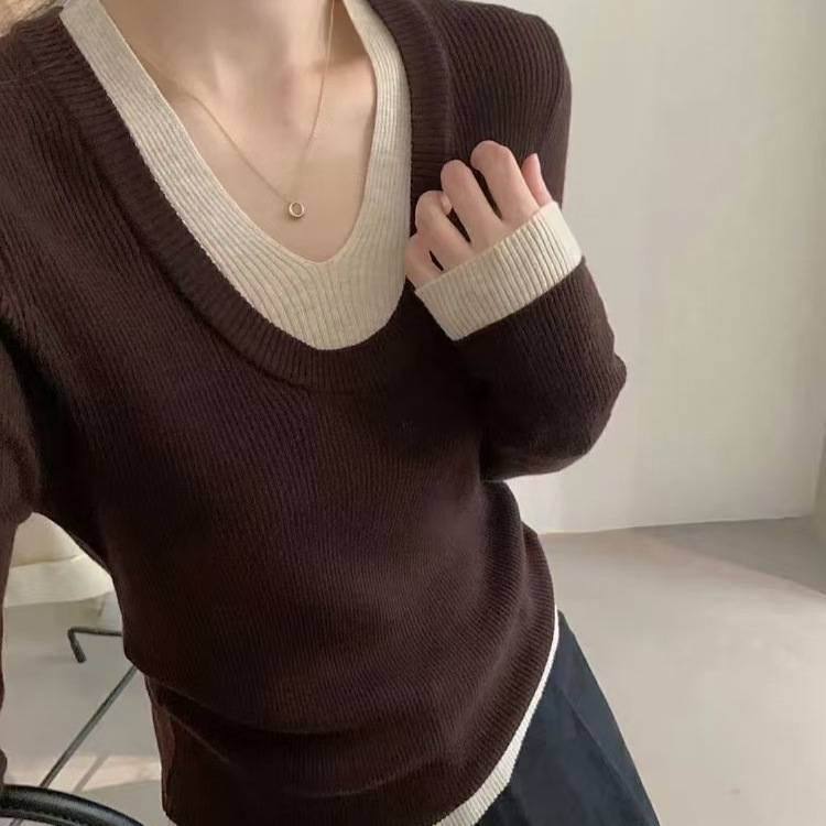 2024春秋季新款显瘦修身百搭小众撞色拼接假两件V领显瘦针织上衣