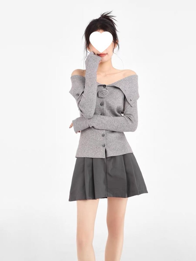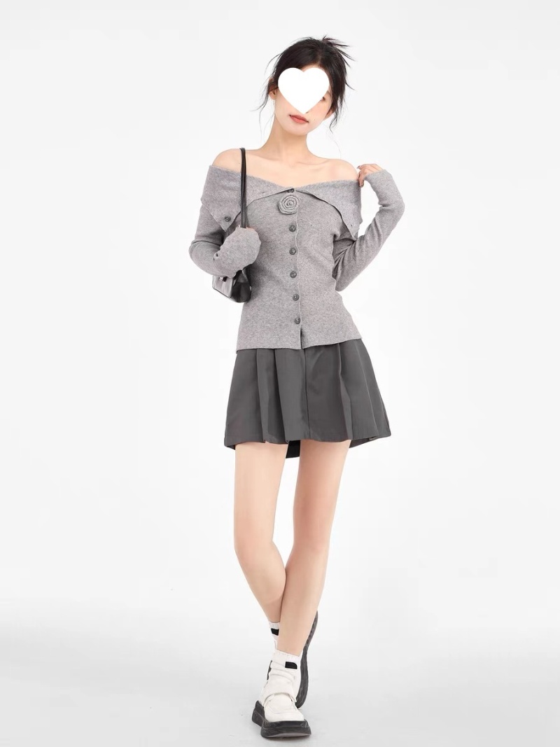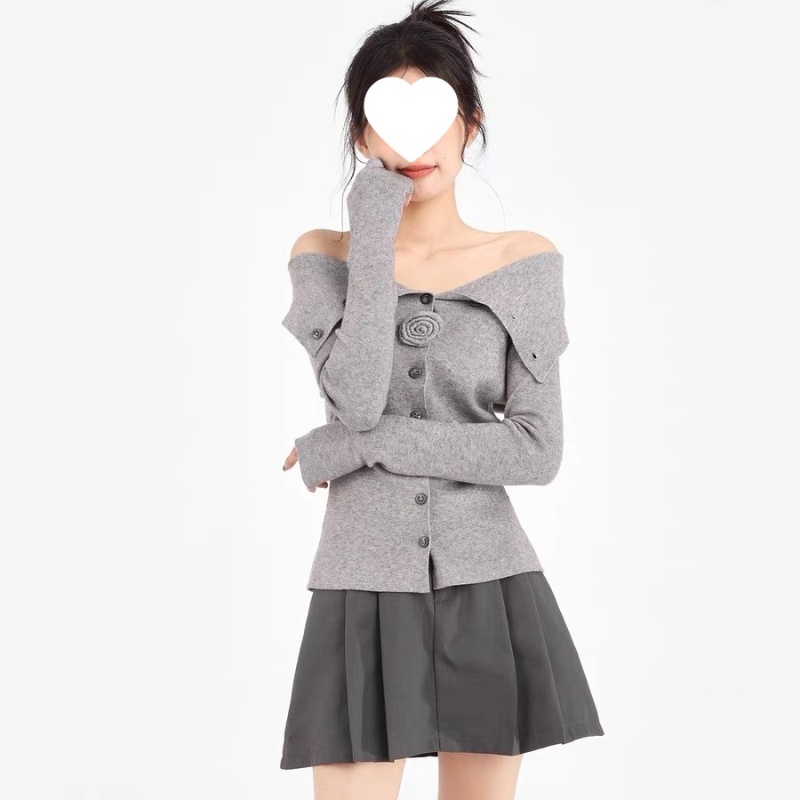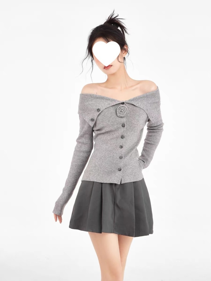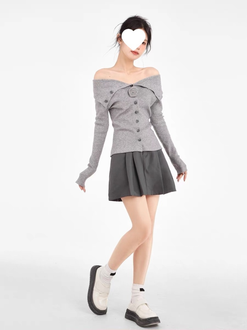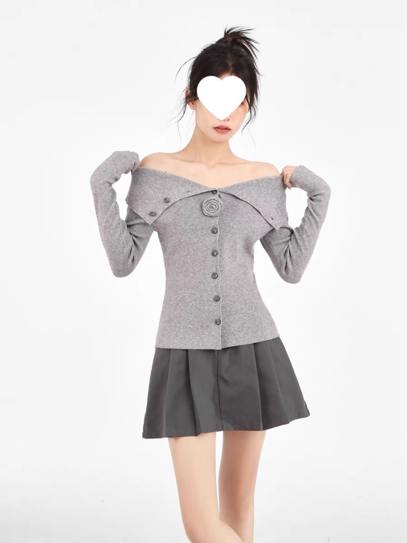 灰色一字肩翻领针织衫女早秋修身内搭打底衫毛衣露肩长袖上衣秋季