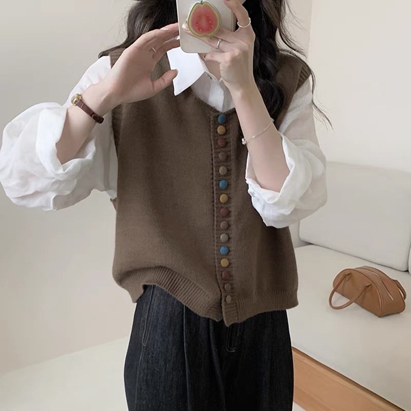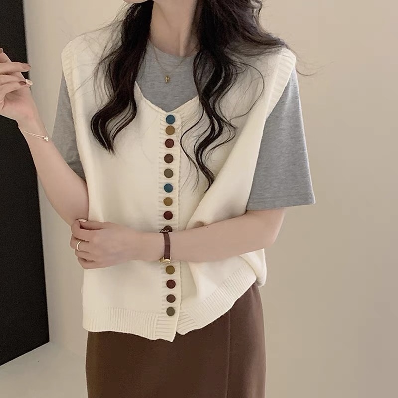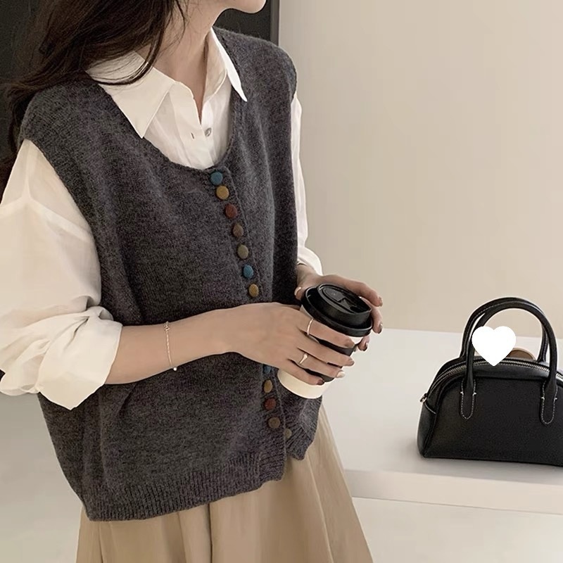 复古洋气彩虹纽扣圆领针织马甲背心女2024秋冬新款叠穿百搭上衣女