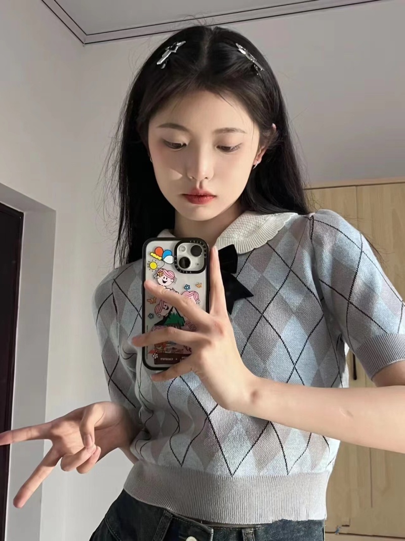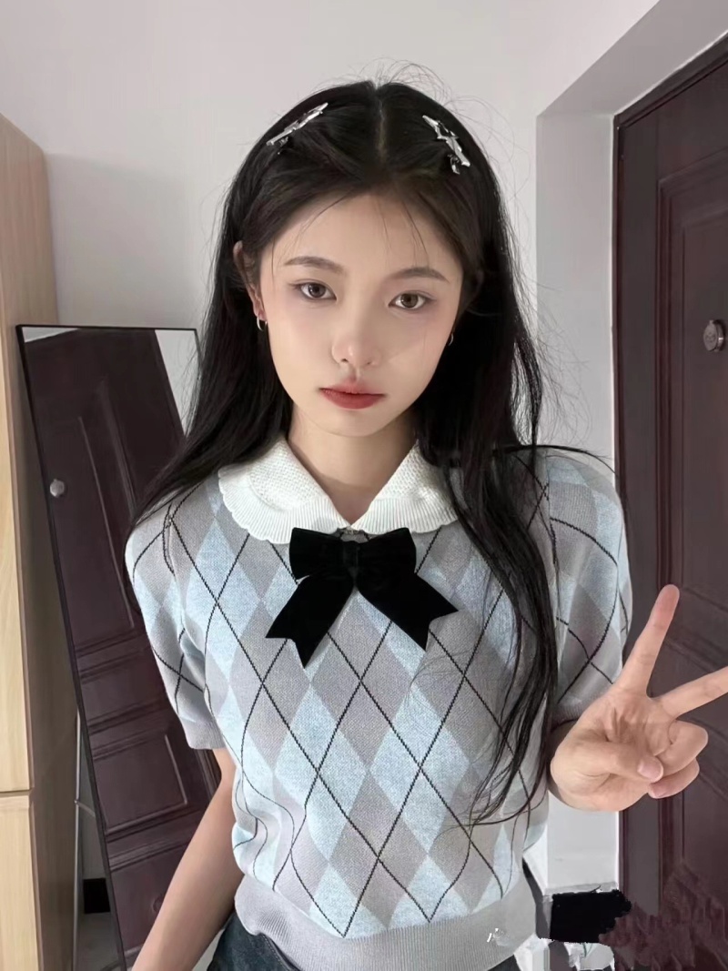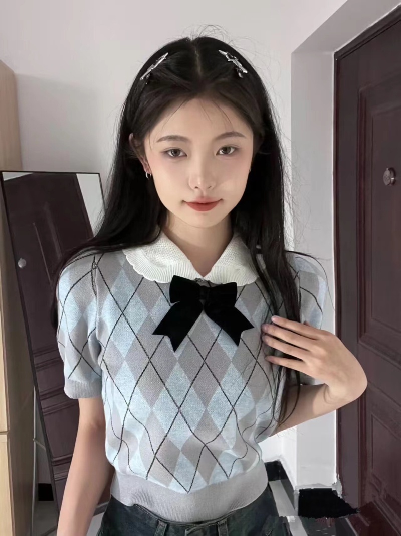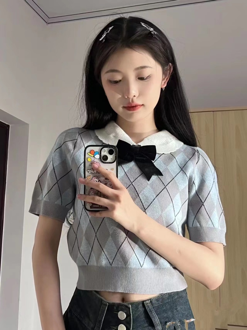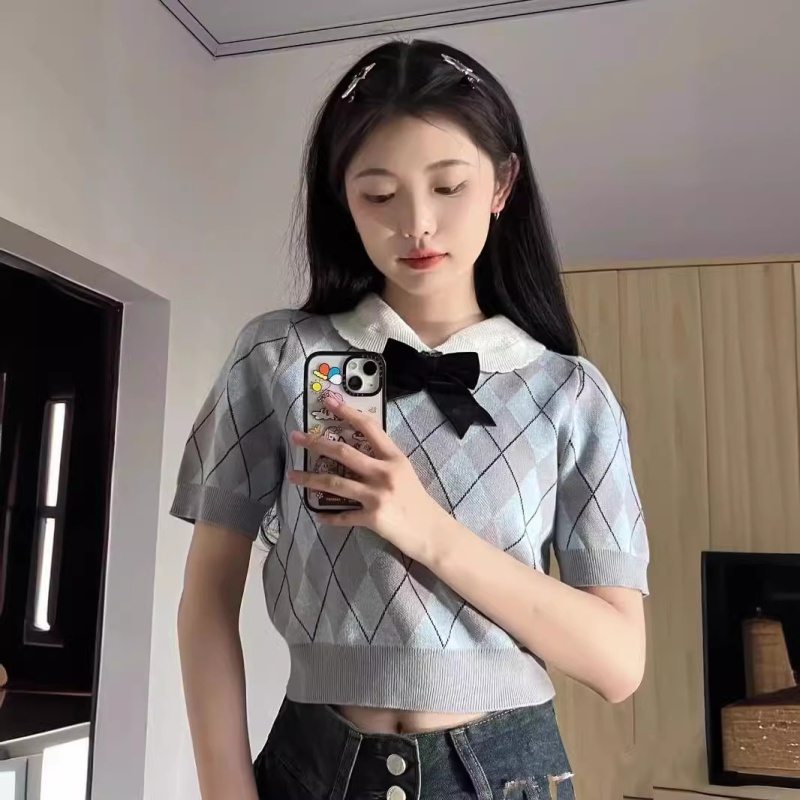 娃娃领短袖正肩t恤女2024年夏季新款设计感小众短款甜辣针织上衣