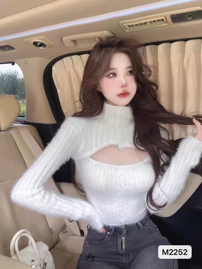 春季纯欲甜辣仿水貂绒针织衫女镂空毛衣打底衫短款软糯温柔风上衣