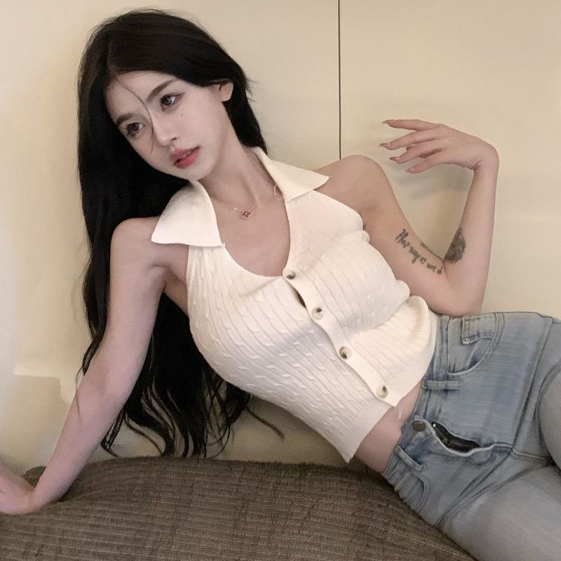 POLO领挂脖式针织背心女设计感别致修身纯欲外穿露肩无袖短款上衣