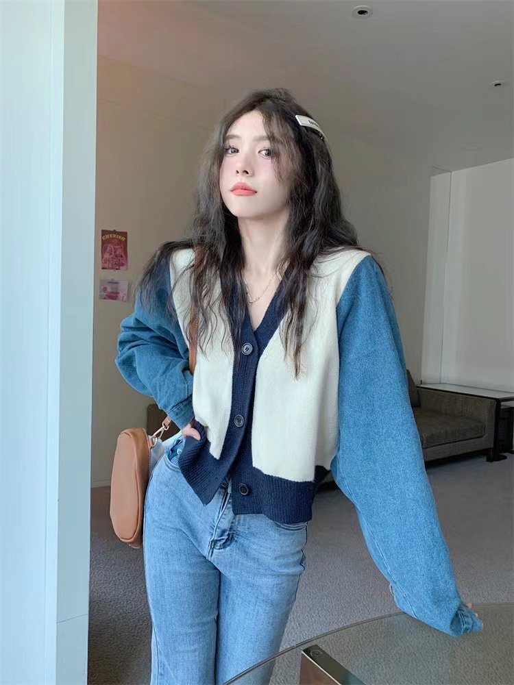 韩版宽松牛仔拼接V领针织开衫校园学院ins风格设计感时尚少女穿搭