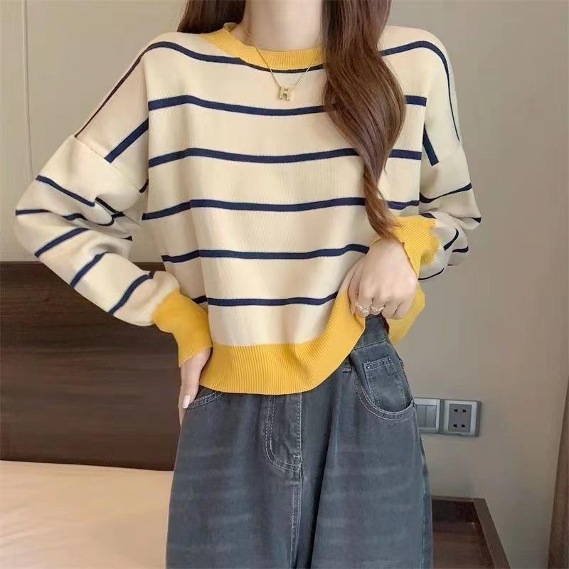 圆领条纹套头短款长袖修身针织打底衫女秋冬季女装新款毛衣上衣女