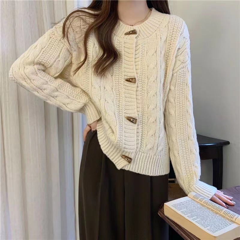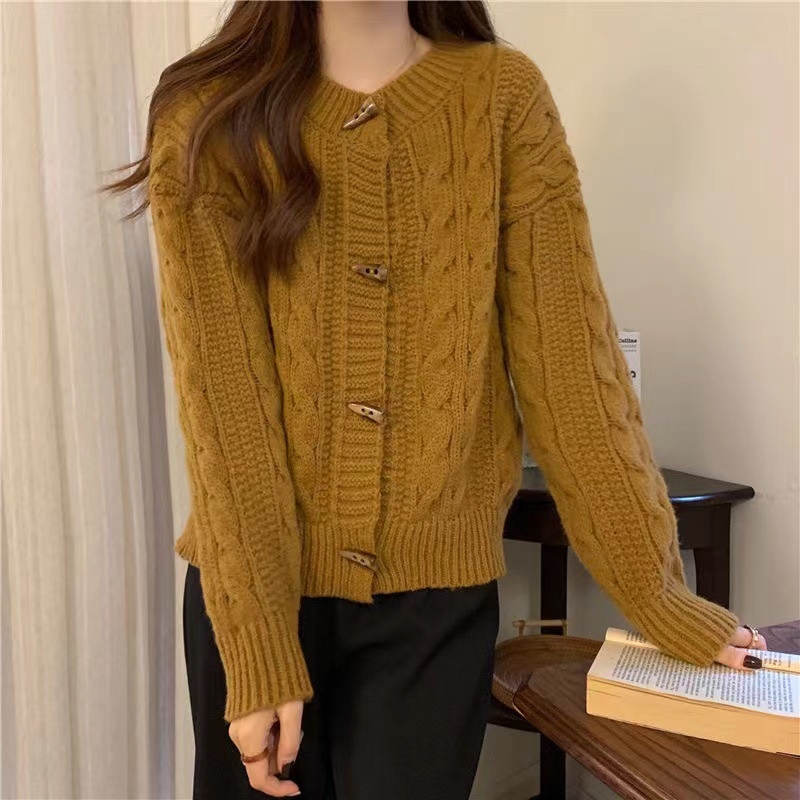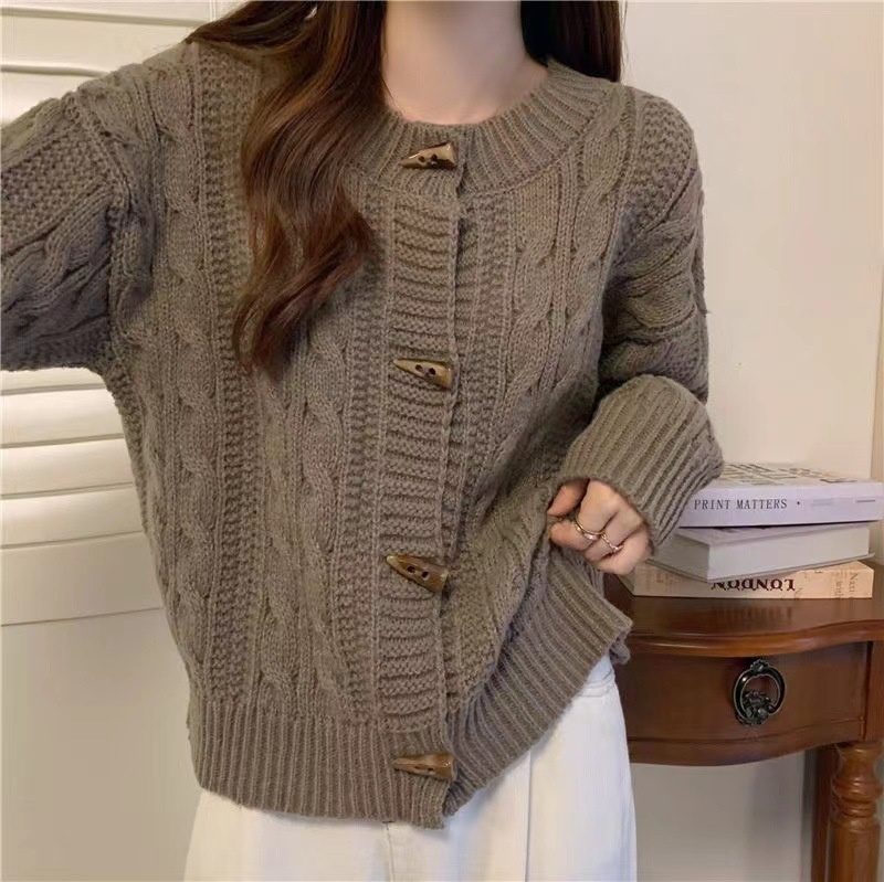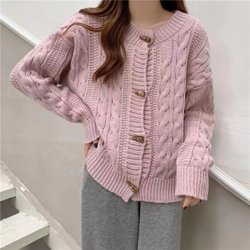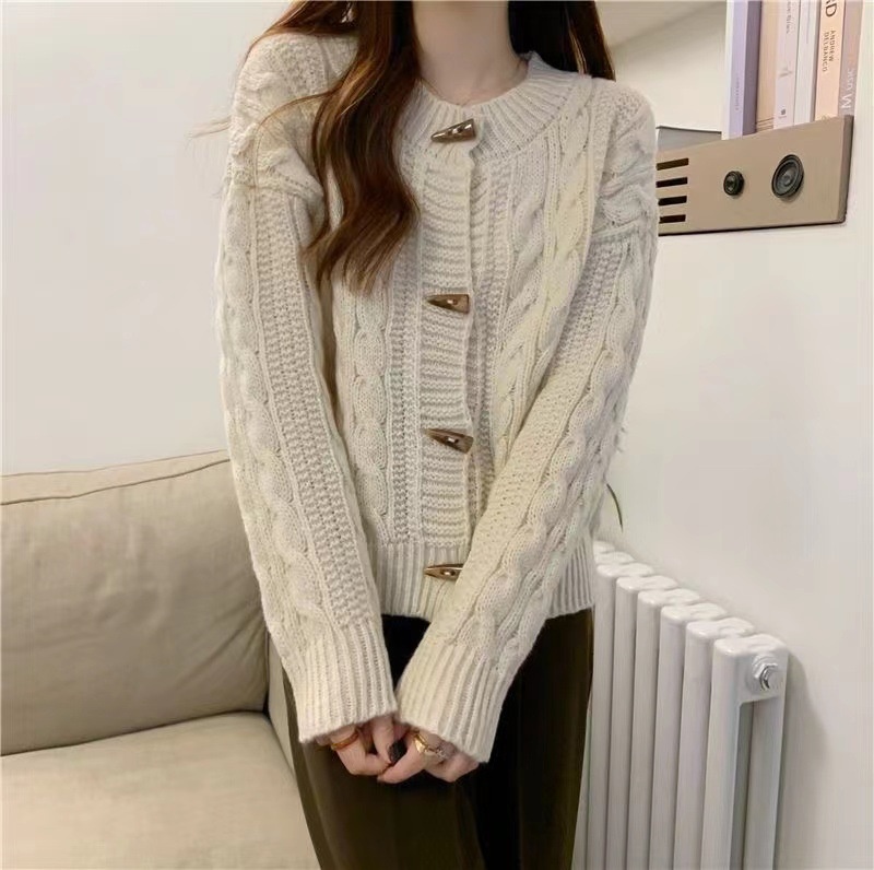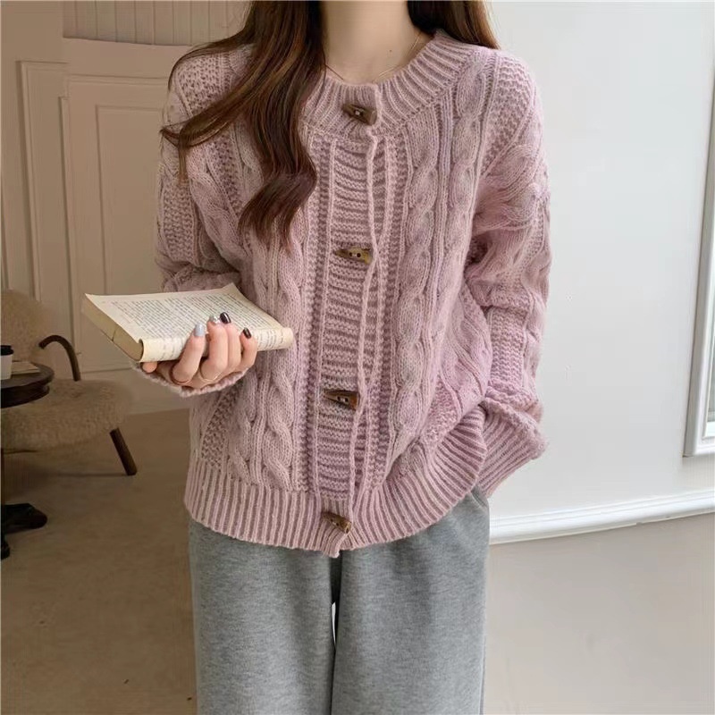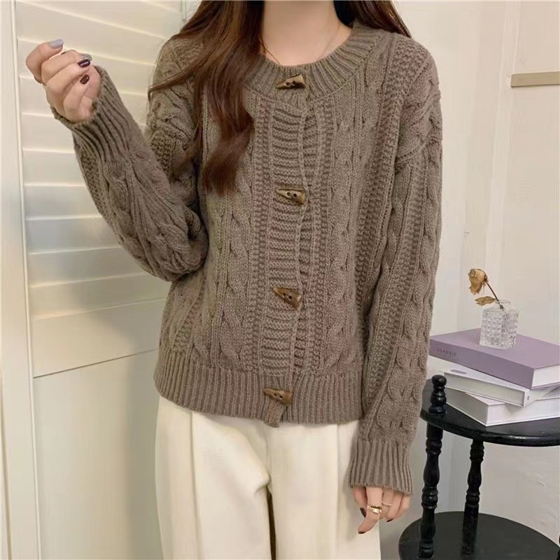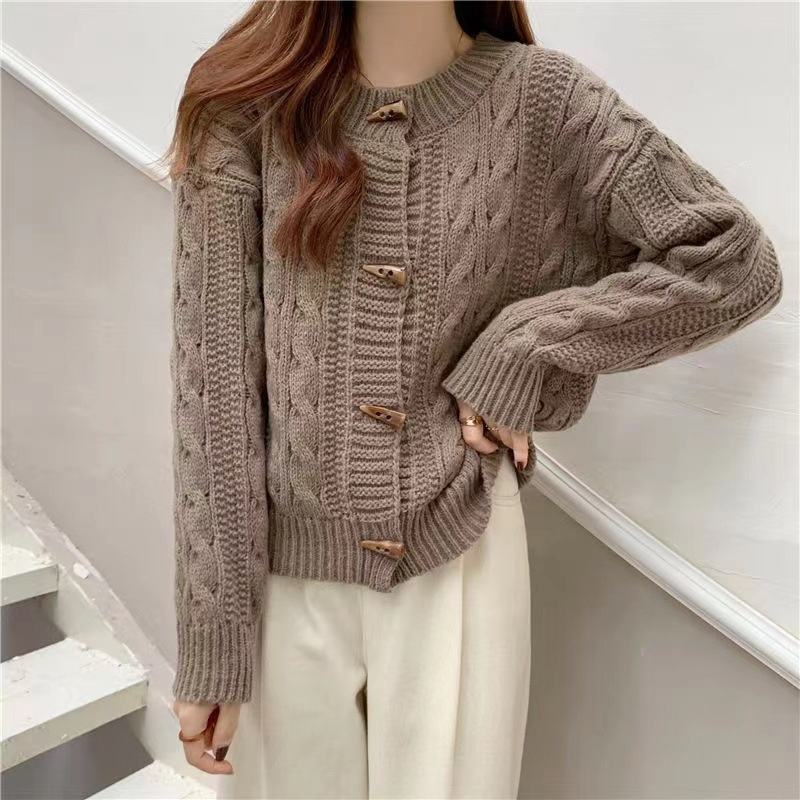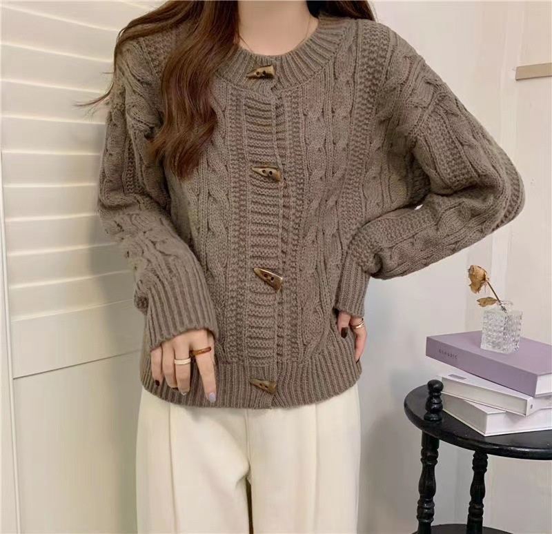 2022秋冬季新款宽松软糯慵懒风上衣小外套圆领麻花毛衣针织开衫女