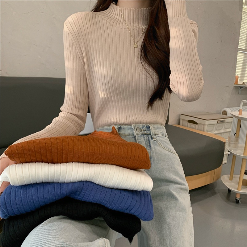 半高领套头毛衣女基础款秋冬修身百搭坑条长袖针织打底衫内搭上衣