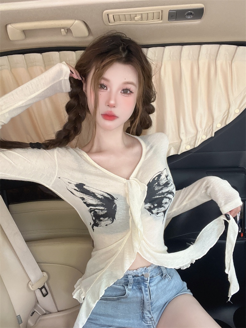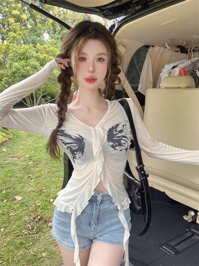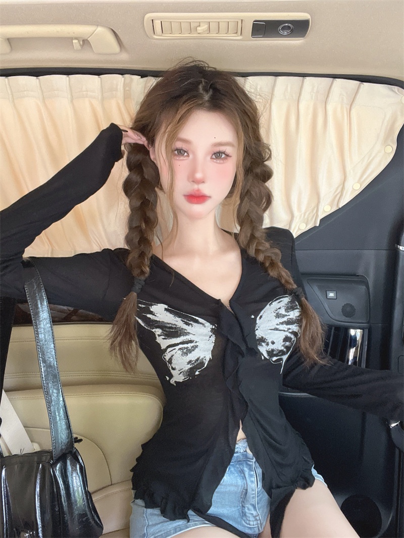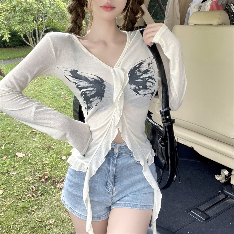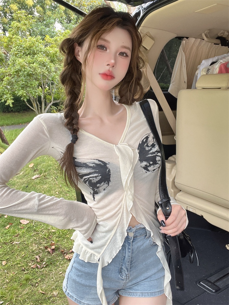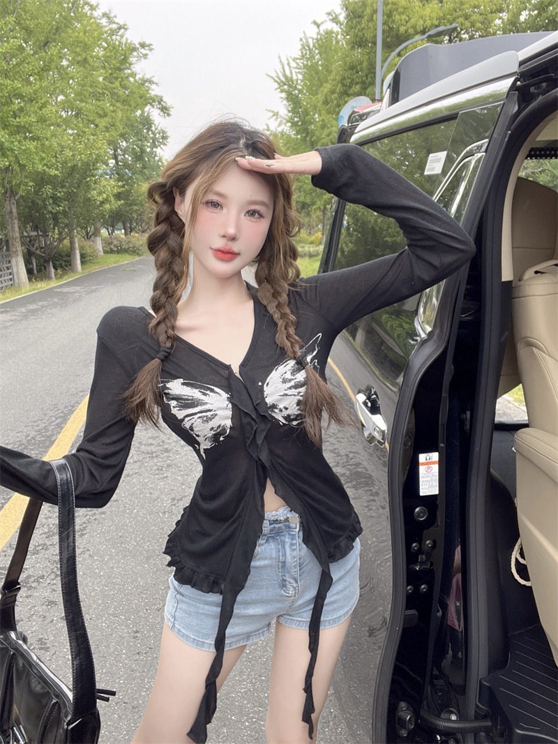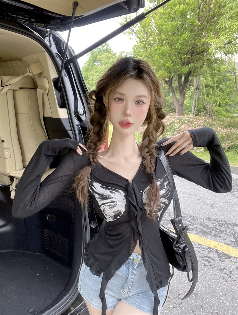2024早秋纯欲风深V领拼接长袖木耳边超修身涂鸦薄款暗扣开衫T恤女