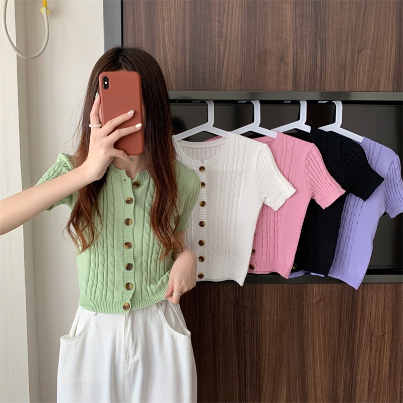 冰丝圆领针织开衫短袖T恤女夏季韩版新款修身显瘦甜辣风短款上衣