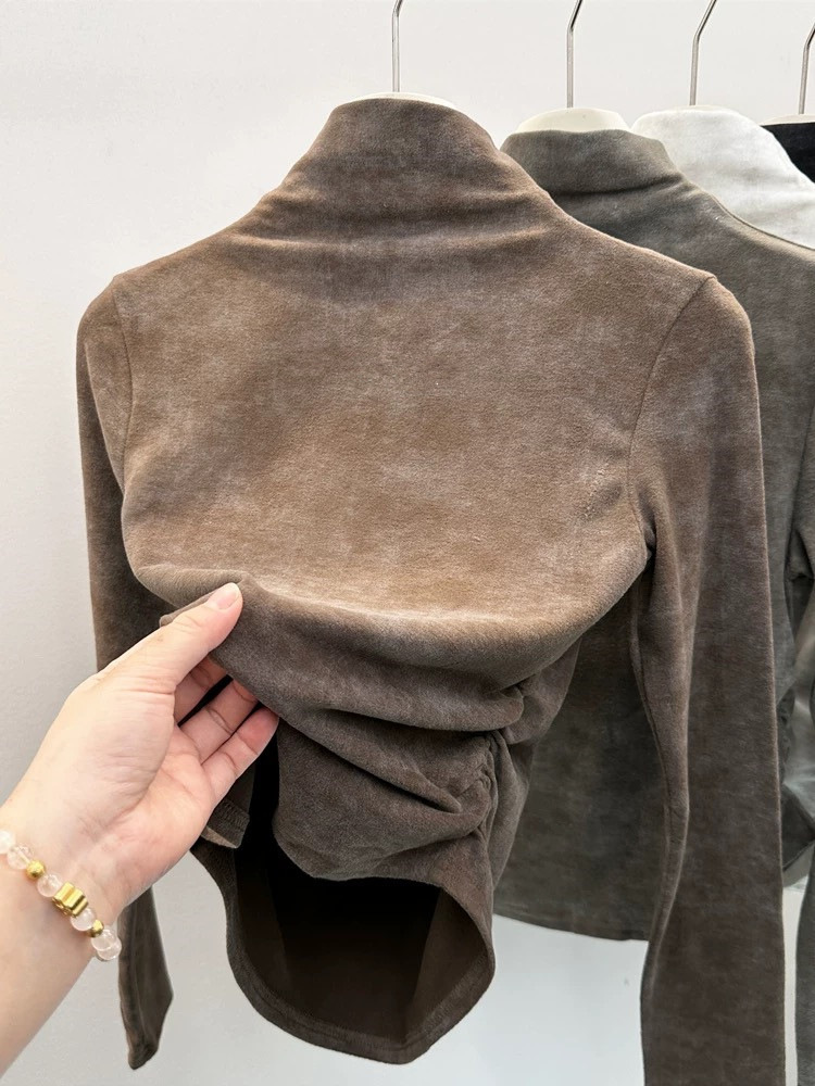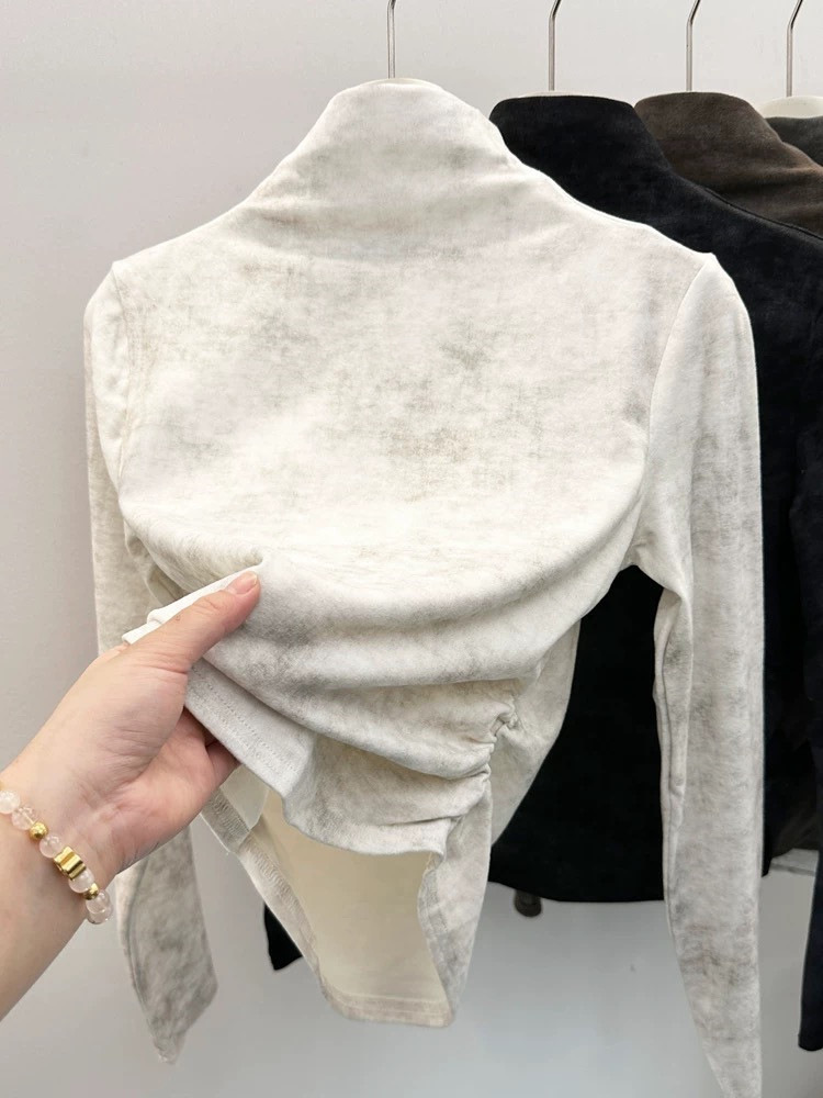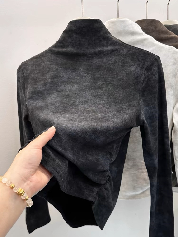2024冬季新款小众正肩半高领褶皱收腰扎染长袖德绒内搭上衣女T恤