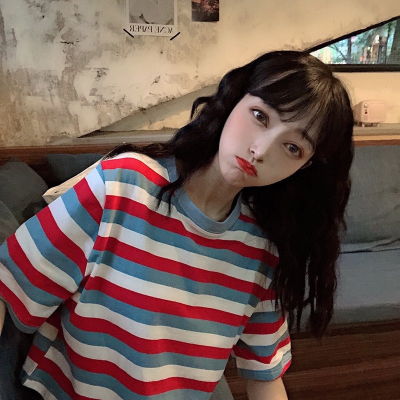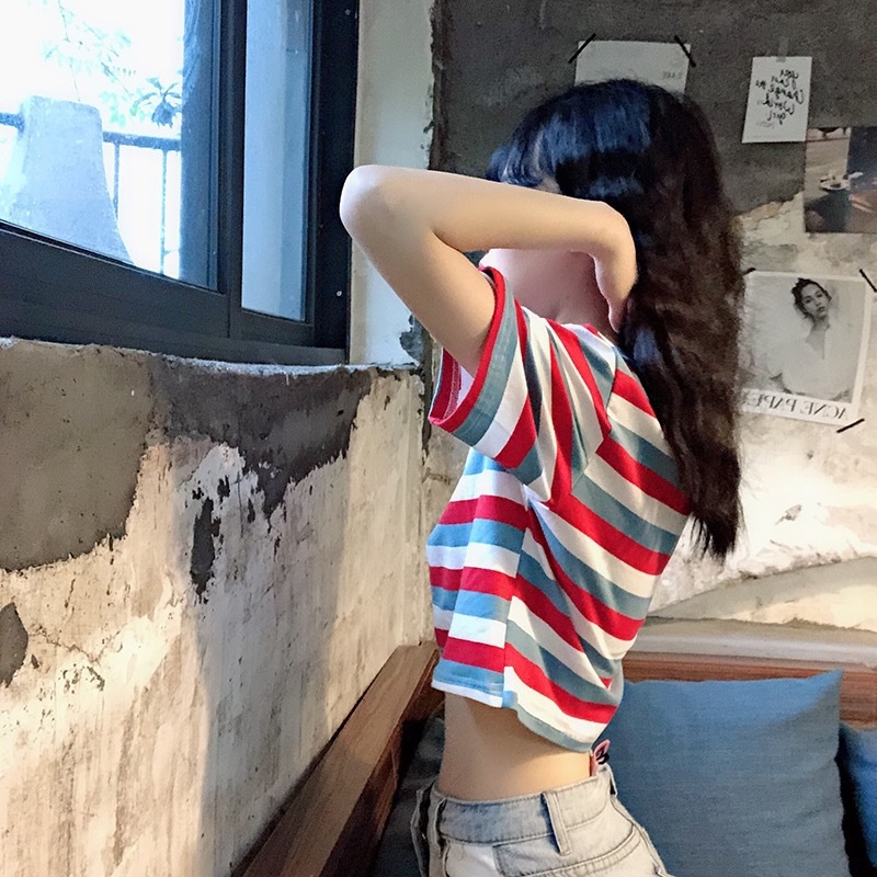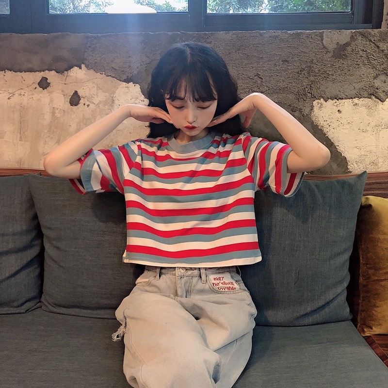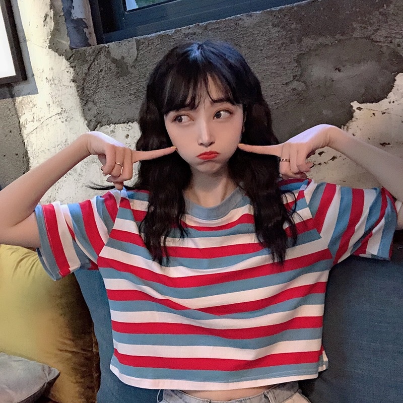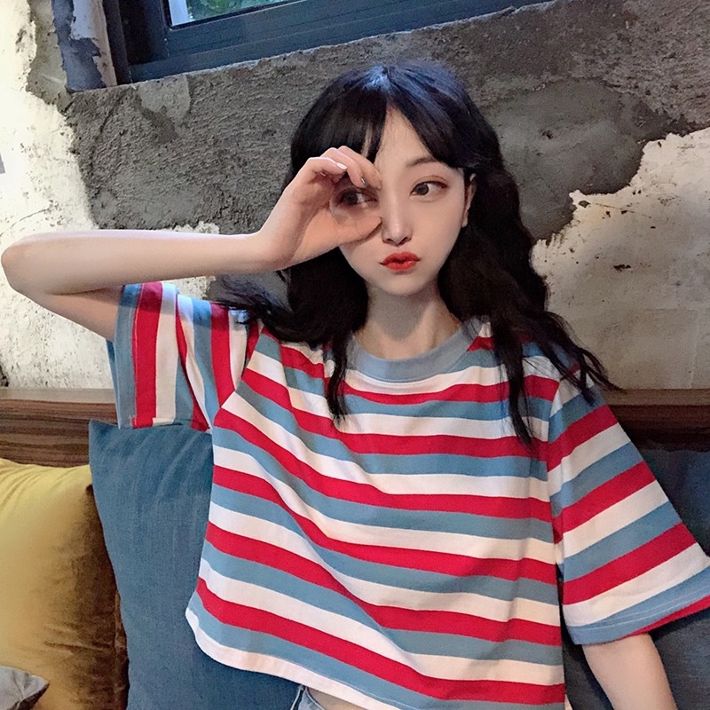 2025夏季新款宽松彩虹条纹短袖T恤女泫雅风学生短款露脐上衣ins潮