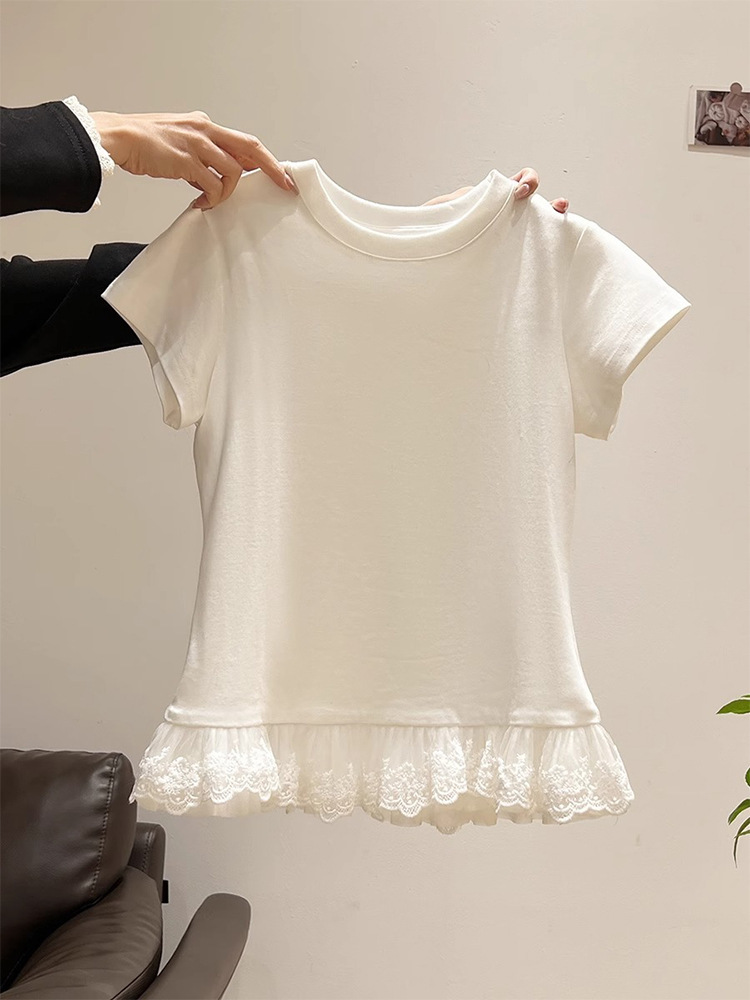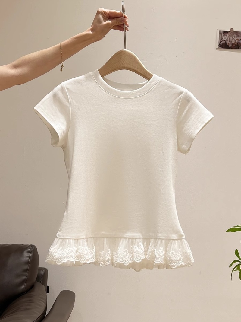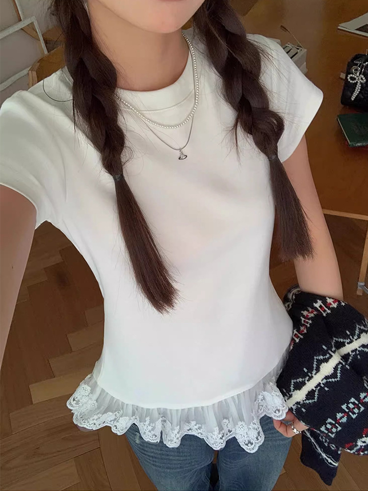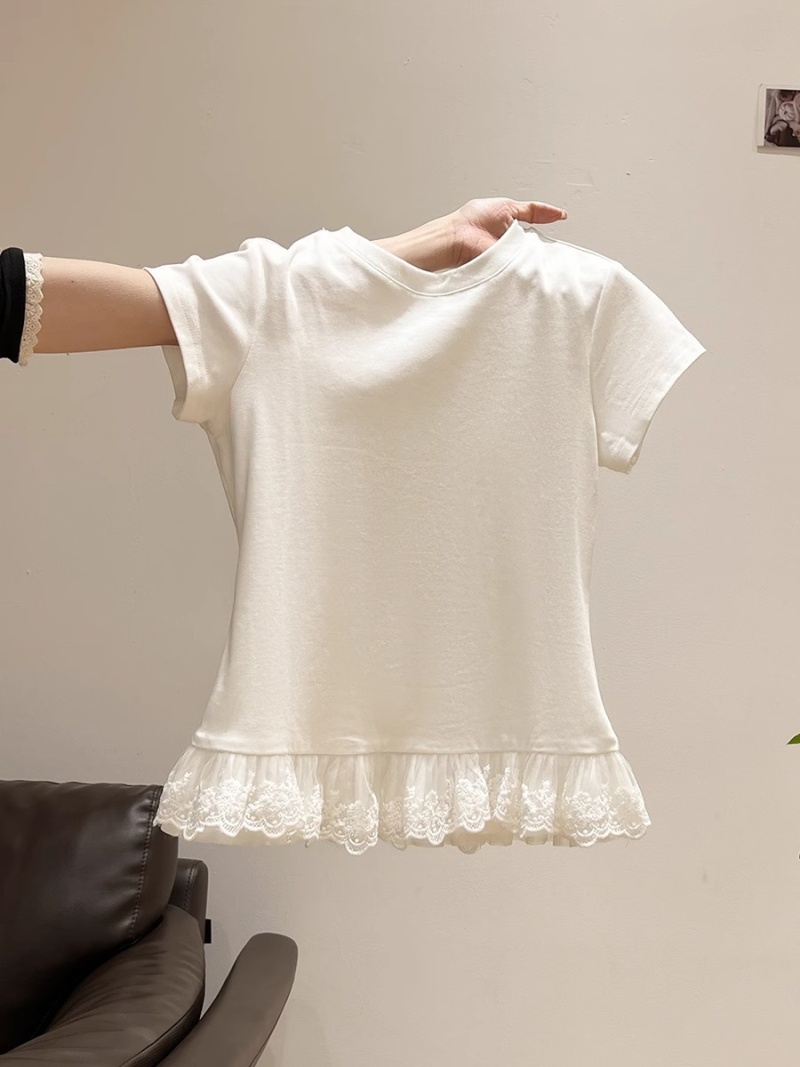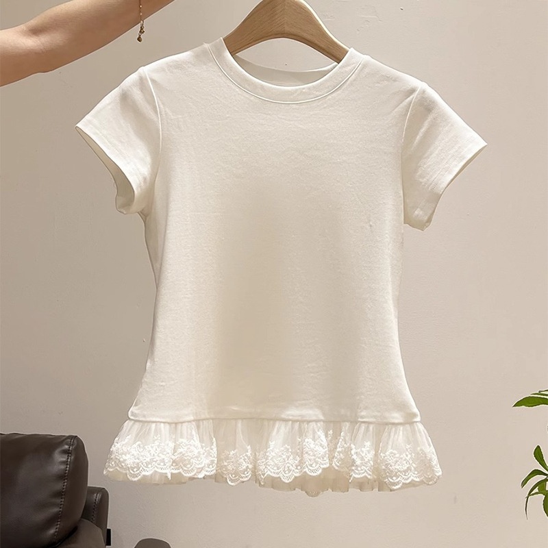 纯欲蕾丝花边下摆圆领短袖T恤女2025夏季新款修身显瘦学生上衣潮