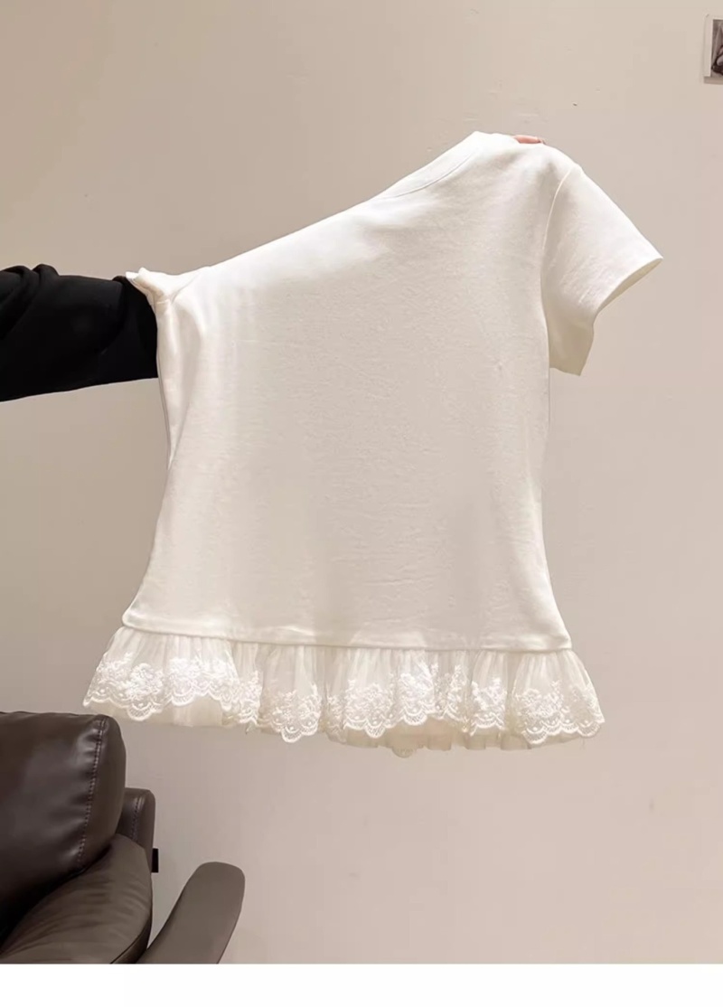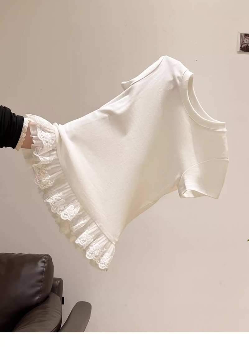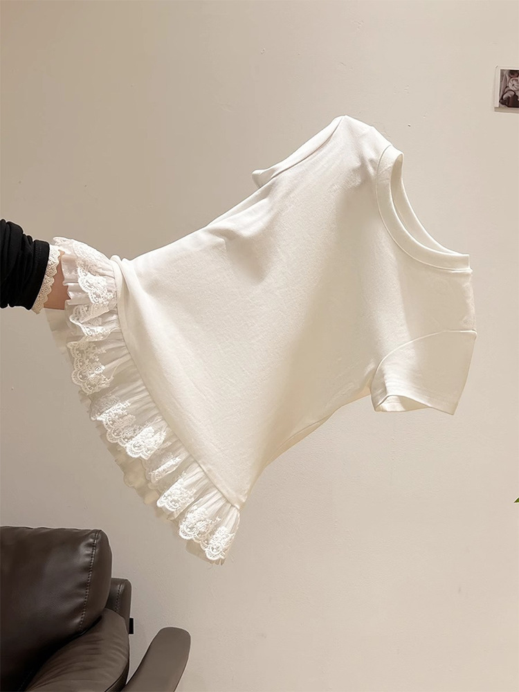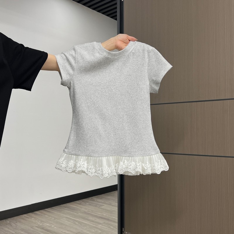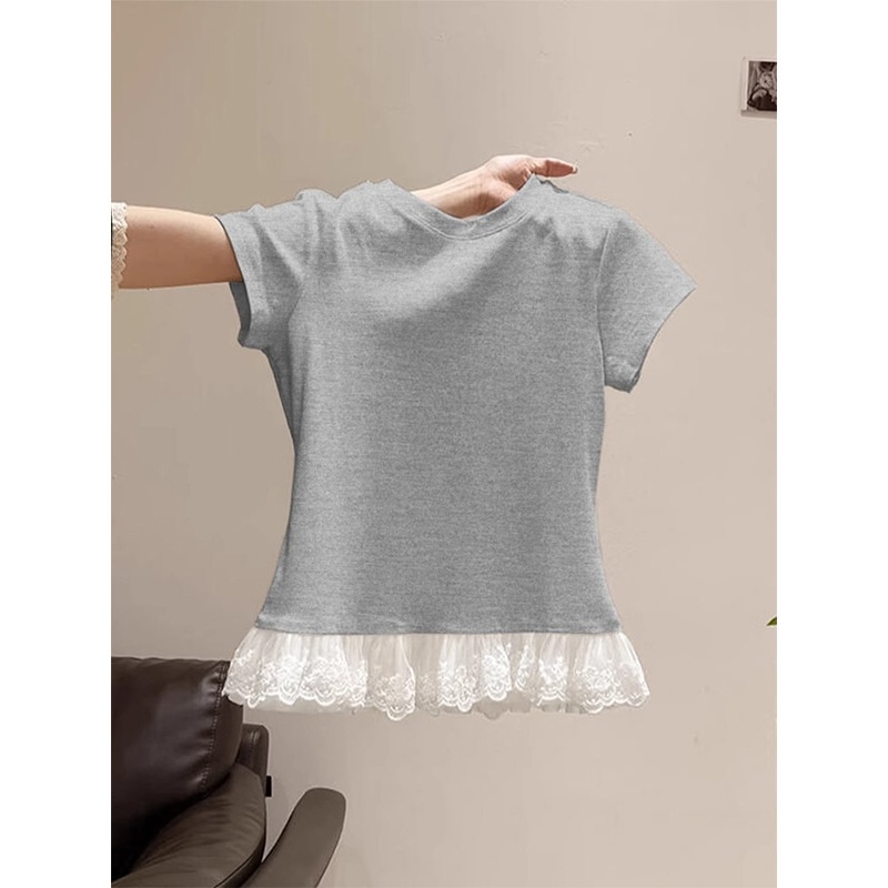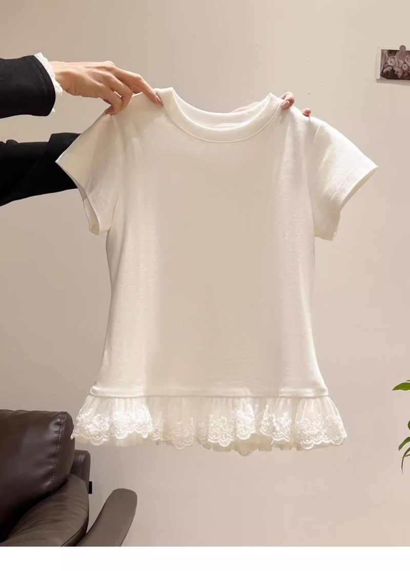 纯欲蕾丝花边下摆圆领短袖T恤女2025夏季新款修身显瘦学生上衣潮