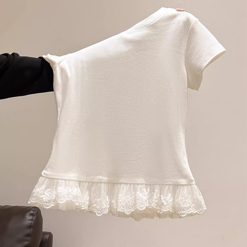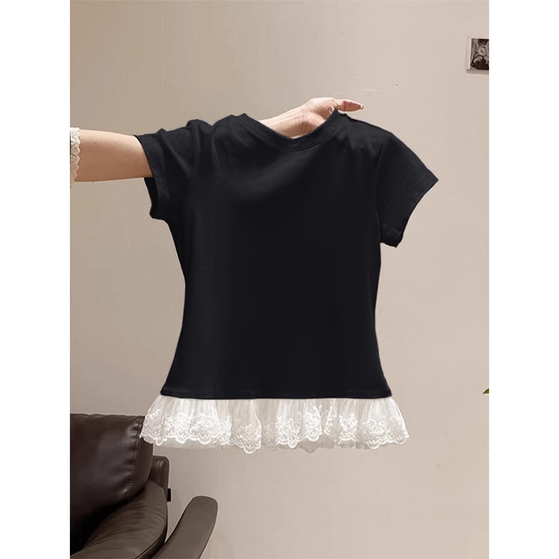 纯欲蕾丝花边下摆圆领短袖T恤女夏季小香风内搭叠穿绝美气质上衣