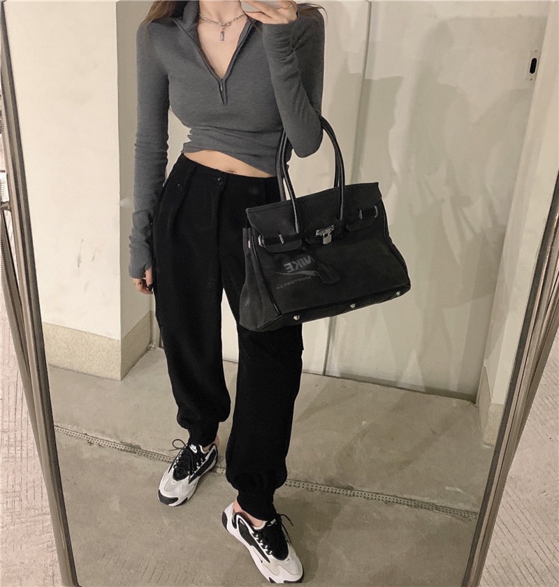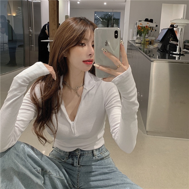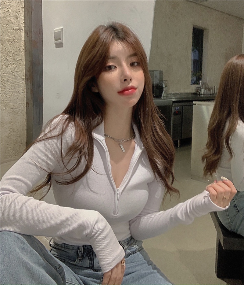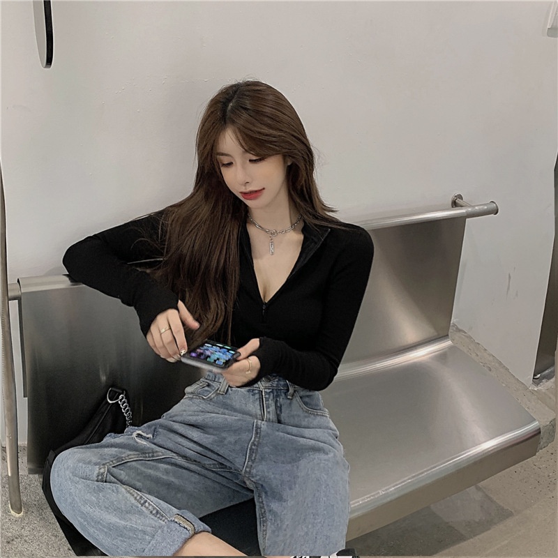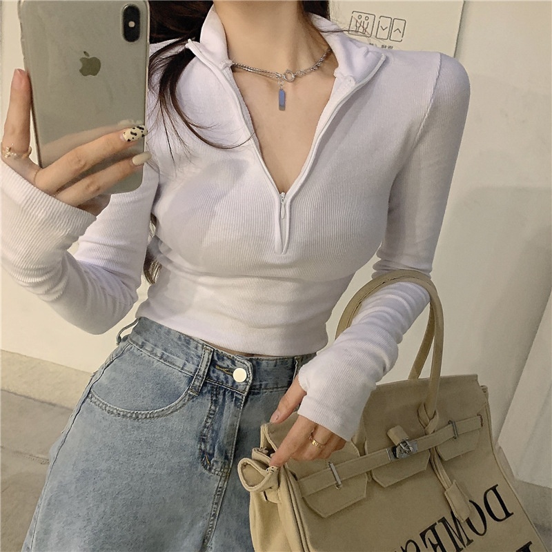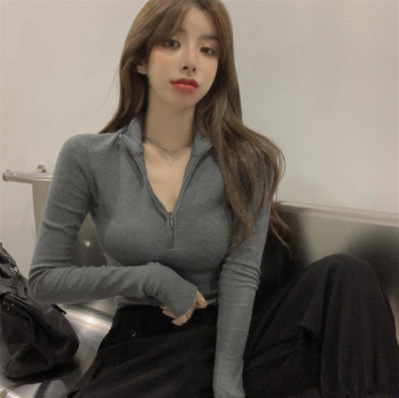 新款打底衫女秋冬韩版长袖T恤半拉链修身性感内搭短款露脐上衣潮