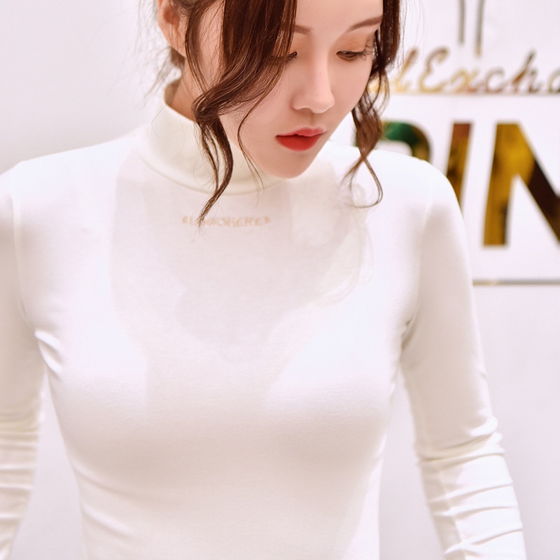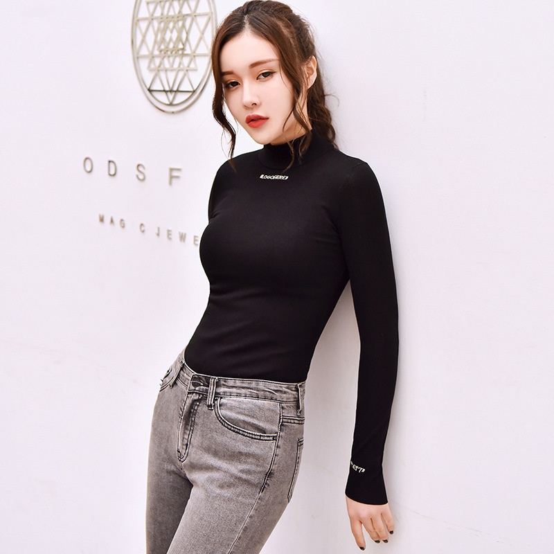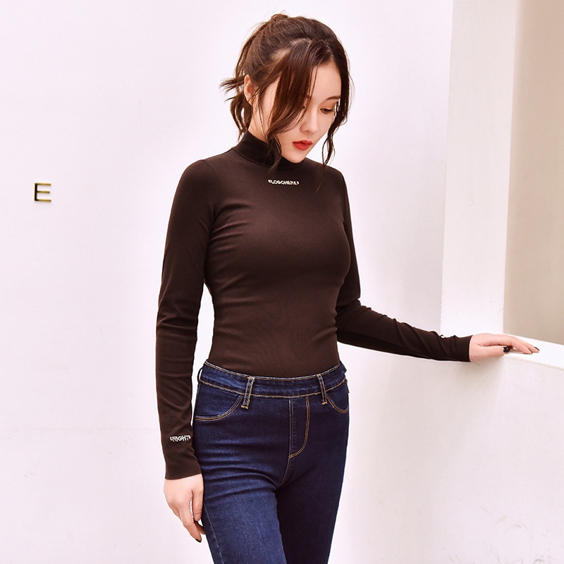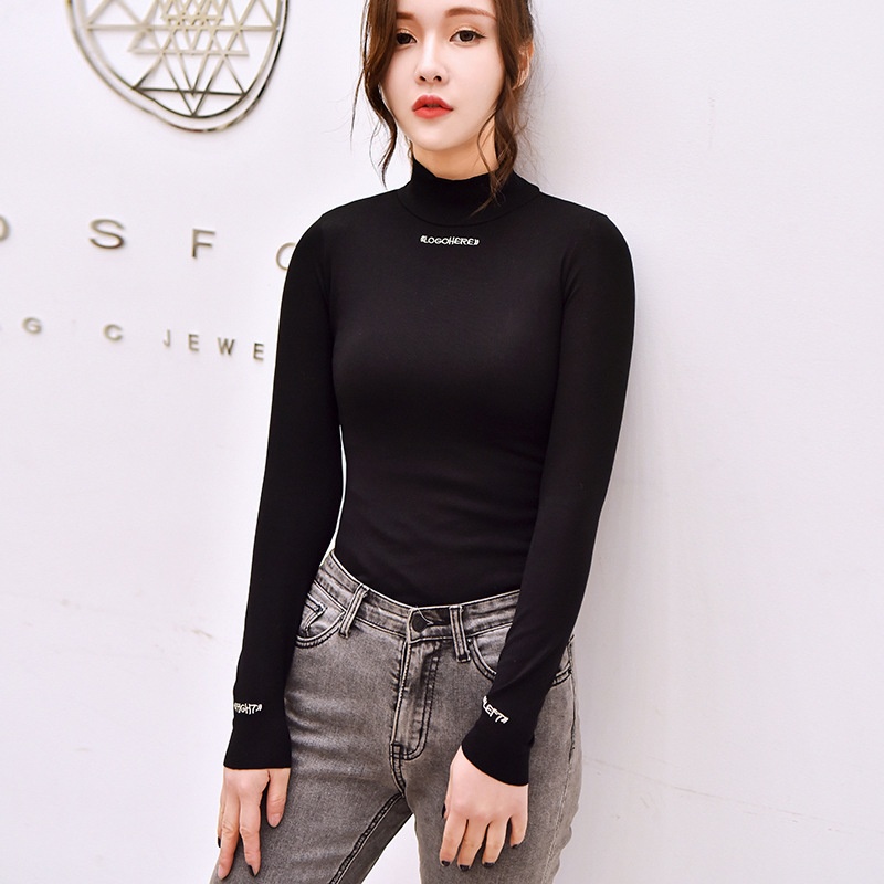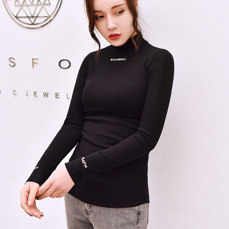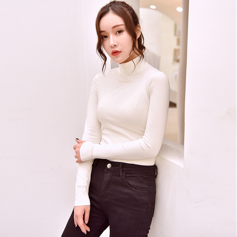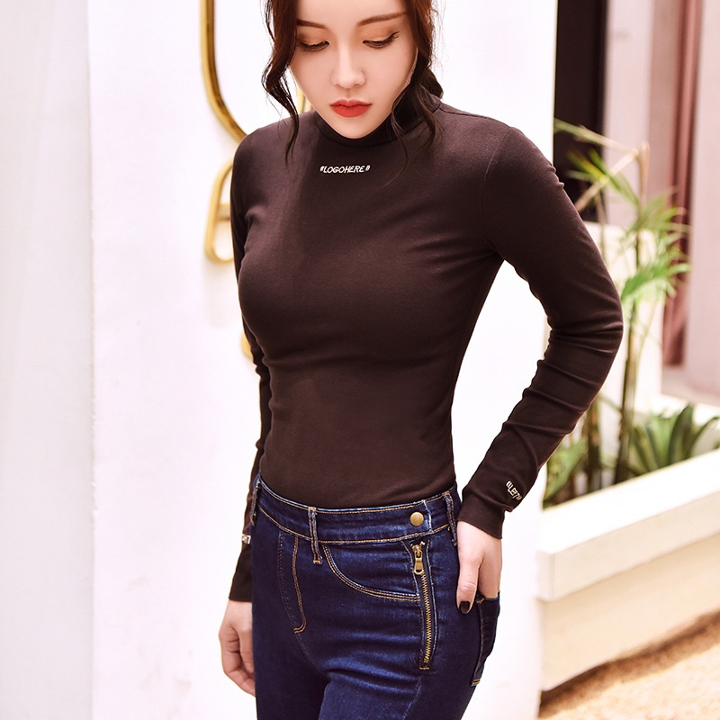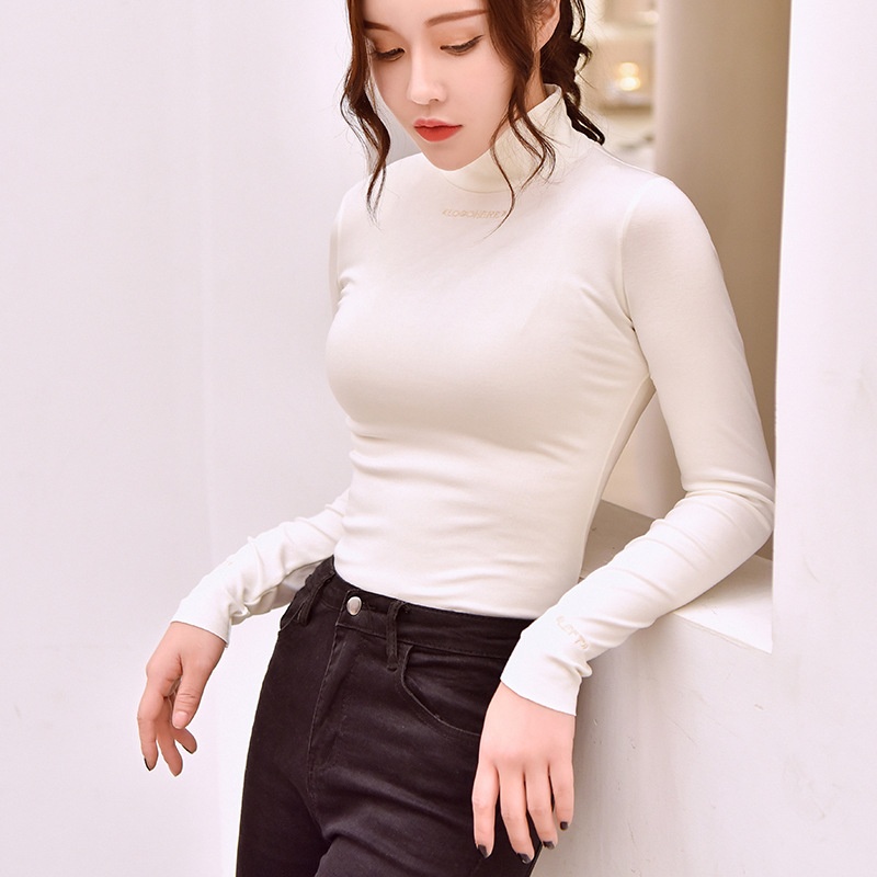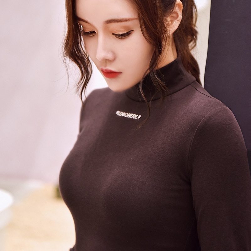 2025半高领上衣加绒打底衫女秋冬字母绣花修身学生纯色长袖t恤女