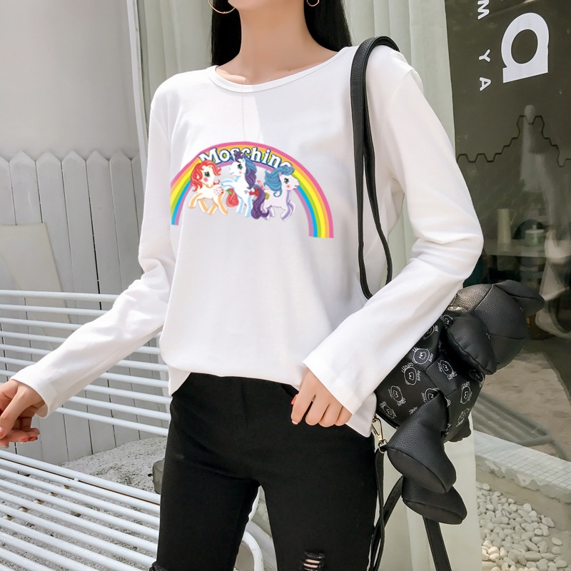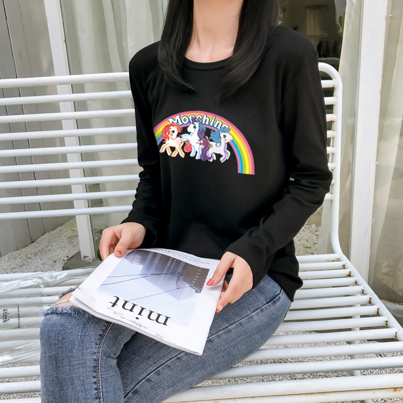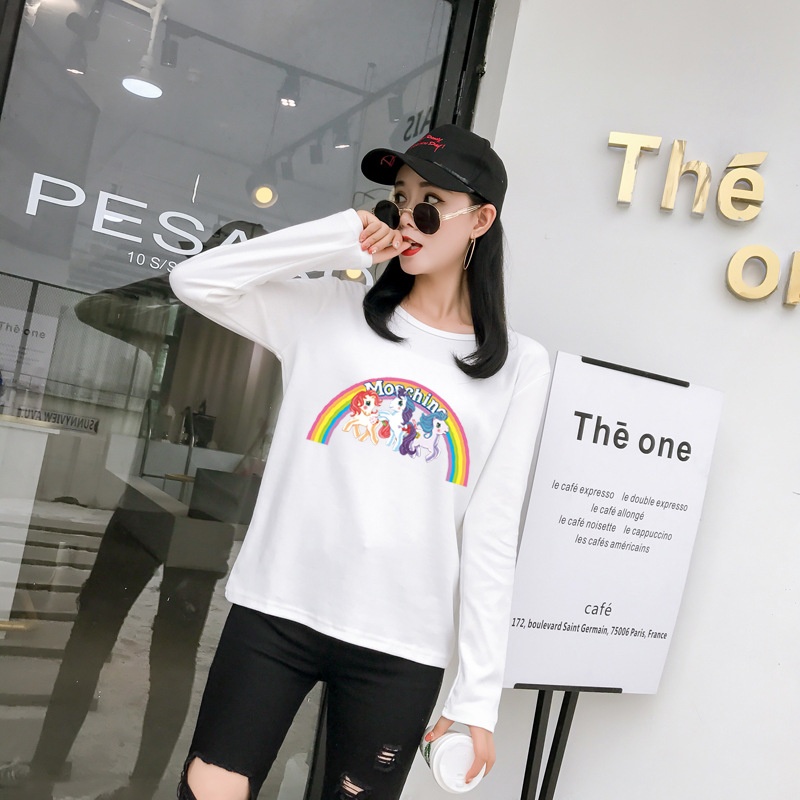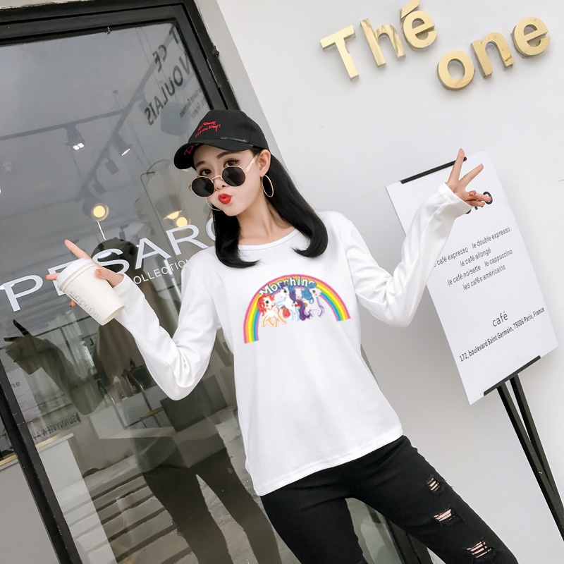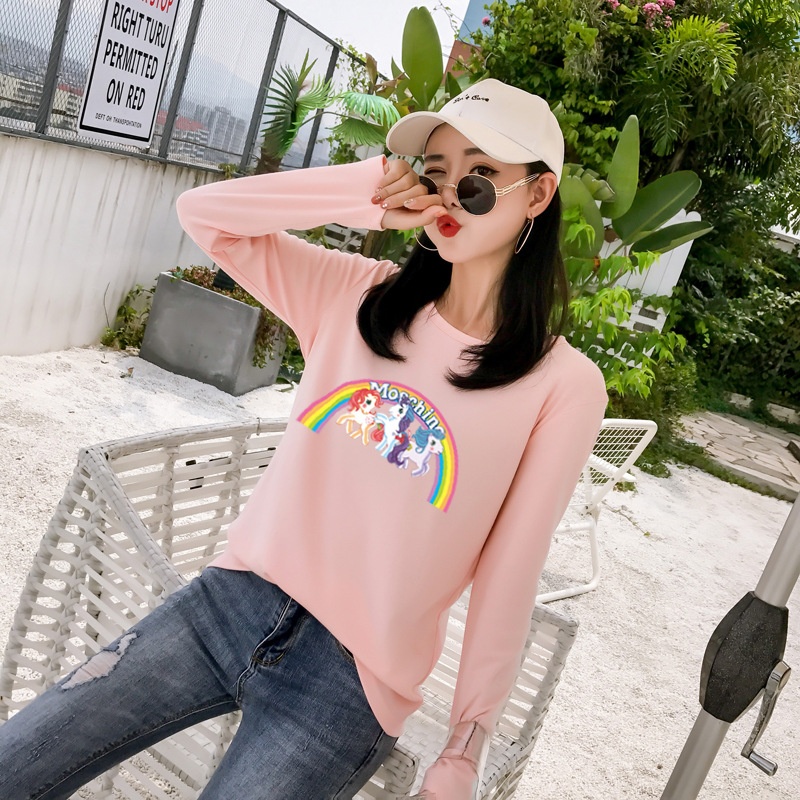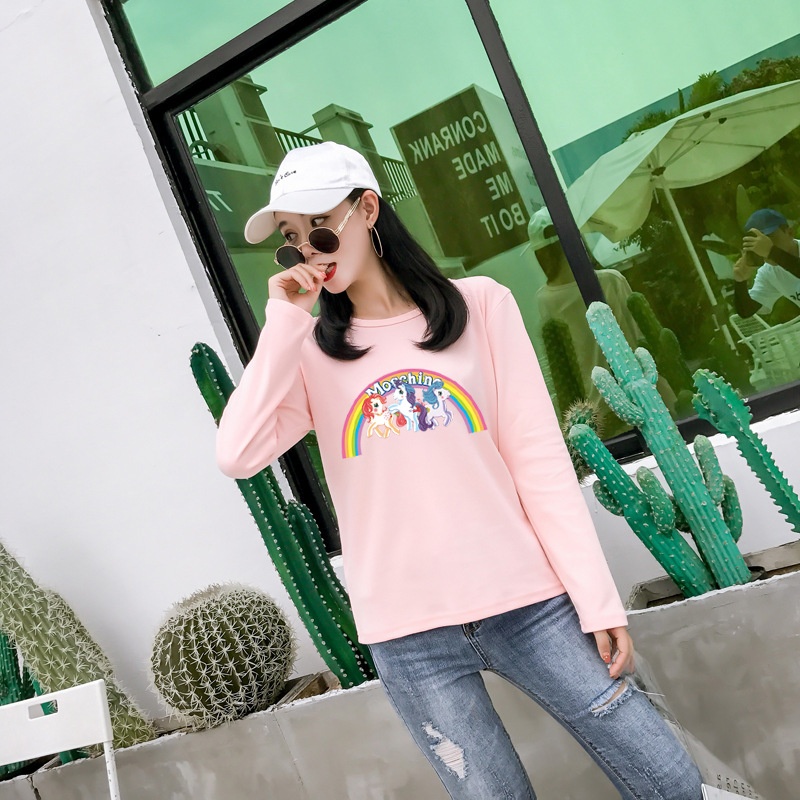 批发女装2025秋装新款韩版宽松彩虹独角兽印花长袖t恤女学生上衣